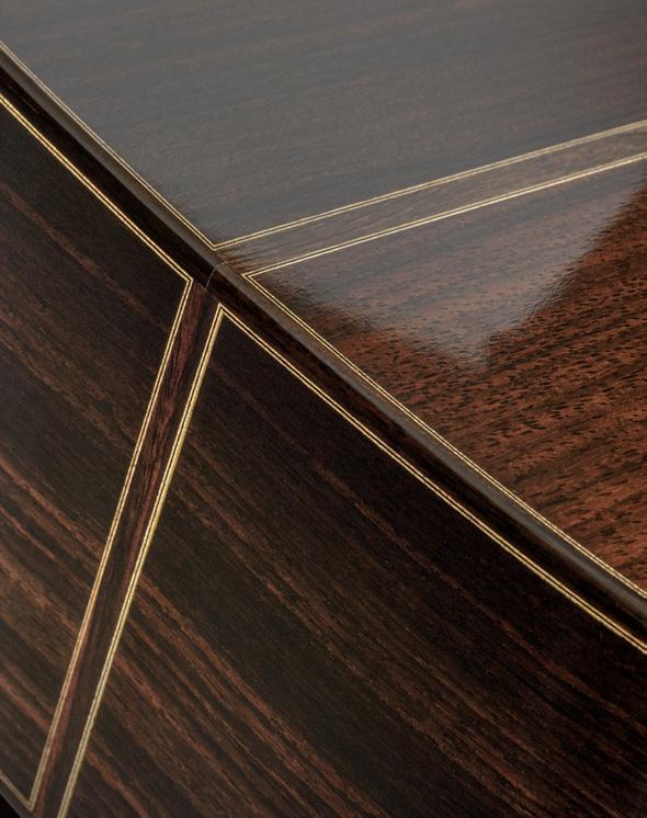 Rosewood is difficult to varnish because of its pores. You need to start with an extremely smooth surface, fill the pores, varnish, sand and then revarnish. It takes a long time to achieve a mirror effect; I spend between three and four weeks on it to obtain a beautiful finish.