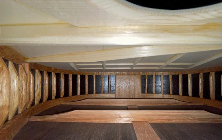 an inlay on a tie-block. It’s a tribute to Simplicio, whose work I very much admire. I wanted to add a refined detail without repeating the mosaic. There are also features that stem from the French tradition of cabinet making, such as the bevel on the head, which outlines its shape with light, or the ornamentation in the rosettes, with its somewhat austere yet finely wrought motifs, with woods in natural, undyed colours, so that time won’t fade them. When I need a 1.2 mm width strip of purfling, I’ll tend to use four strips of 0.3 mm instead of one single wider one, in order to create vibrations of colour and light.