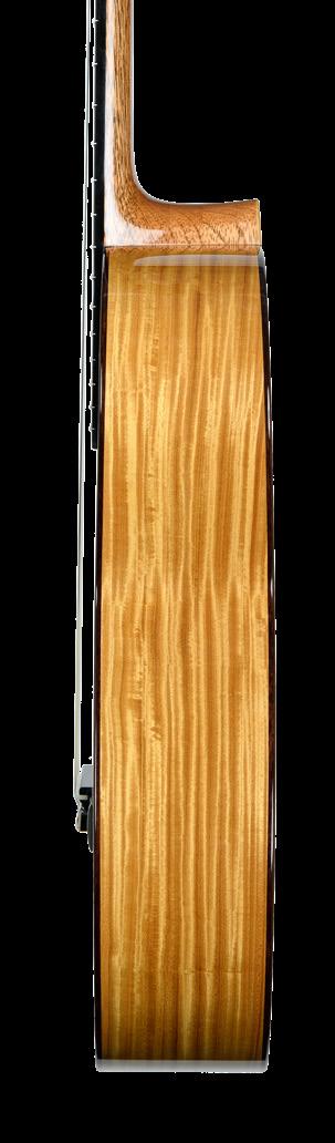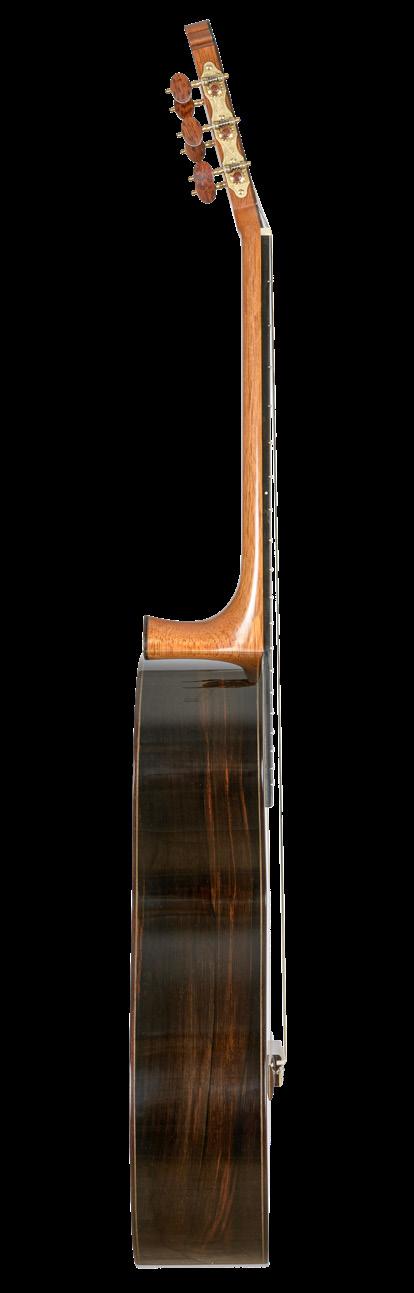 sound was more “all-encompassing”, which was very pleasant for the person playing. I immediately started building a prototype with a rosette-free top and sound hole in the rib. Roland Dyens played for a long time with one of these guitars. The problem with this system was the imbalance between what the audience hears and what the guitarist hears. For the guitarist, there was a kind of “loudspeaker” effect that made the basses sound louder and thus prompted the player to make changes accordingly. I therefore went to work for a year and a half with the Châlons-en-Champagne acoustic laboratory and I ended up modifying the instrument so as to ensure that the guitarist perceived exactly the same sound as the one being projected. This culminated in the model that I call the Maestro HF (high-fidelity), which has two openings, in two different places. I maintained the same sound hole surface area, but divided it into two openings, approximately 1/3 and 2/3 the size of the original: a small sound hole on the upper rib and a large one on the lower rib. It was amazing; you could walk all around the guitar being played and enjoy identical perception of its sound from any given spot. It gave the listener the impression of being “in” the sound.