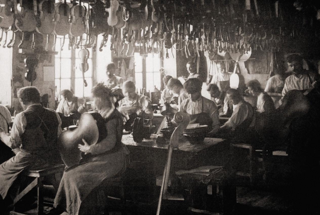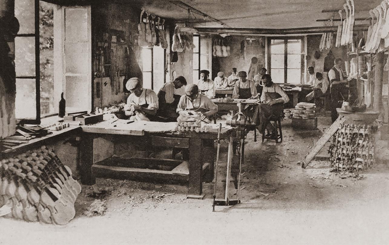 Artisan luthiers, bow-makers and a range of related professions in and around the town made up the industrial lutherie ecosystem: crafting instrument cases, making tools and small mechanical parts, timber splitting, wood turning, sculpting headstocks, varnishing, crafting bridges, preparing horse hair, etc. This system of production continued uninterrupted until 1914.