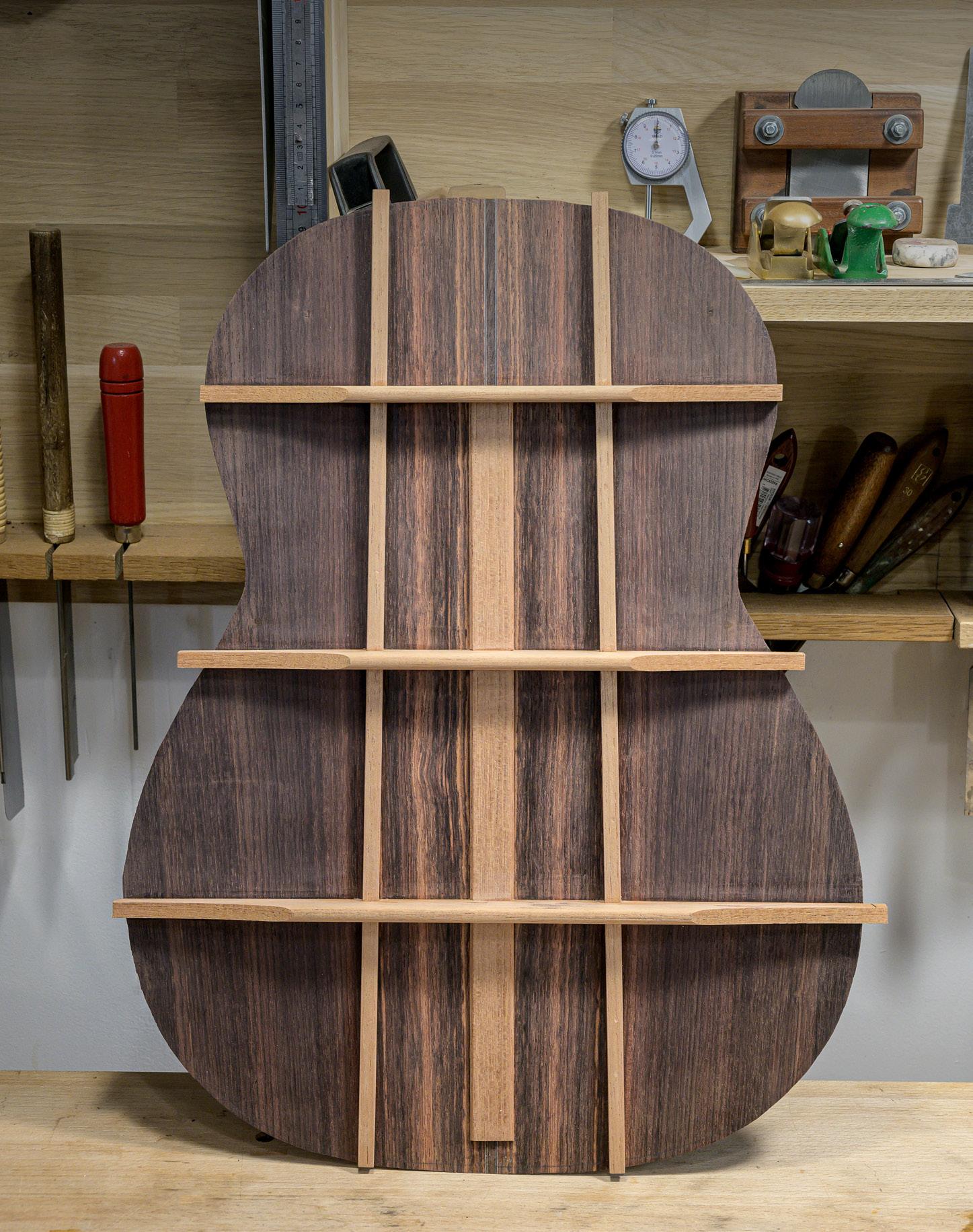 Another detail is the assembly of the ribs into the neck, with small wedges, because I find that this set-up provides excellent strength. The back has two vertical braces as well as the central back seam reinforcement and three horizontals. The back braces and linings are made of cedro. My template is my own; I changed it four times before settling on the current one. Everything has evolved, the overall shape, the domes. Lutherie boils down to an unceasing search…