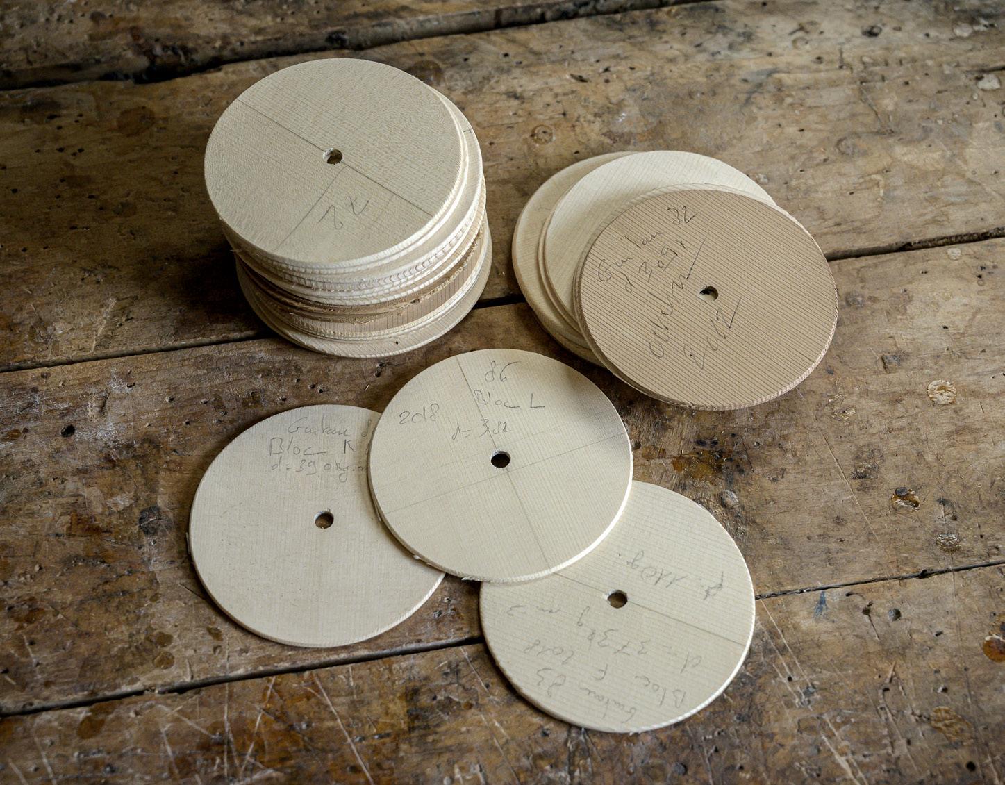 For each guitar, he notes down the characteristics of its wood on the circular off-cuts.