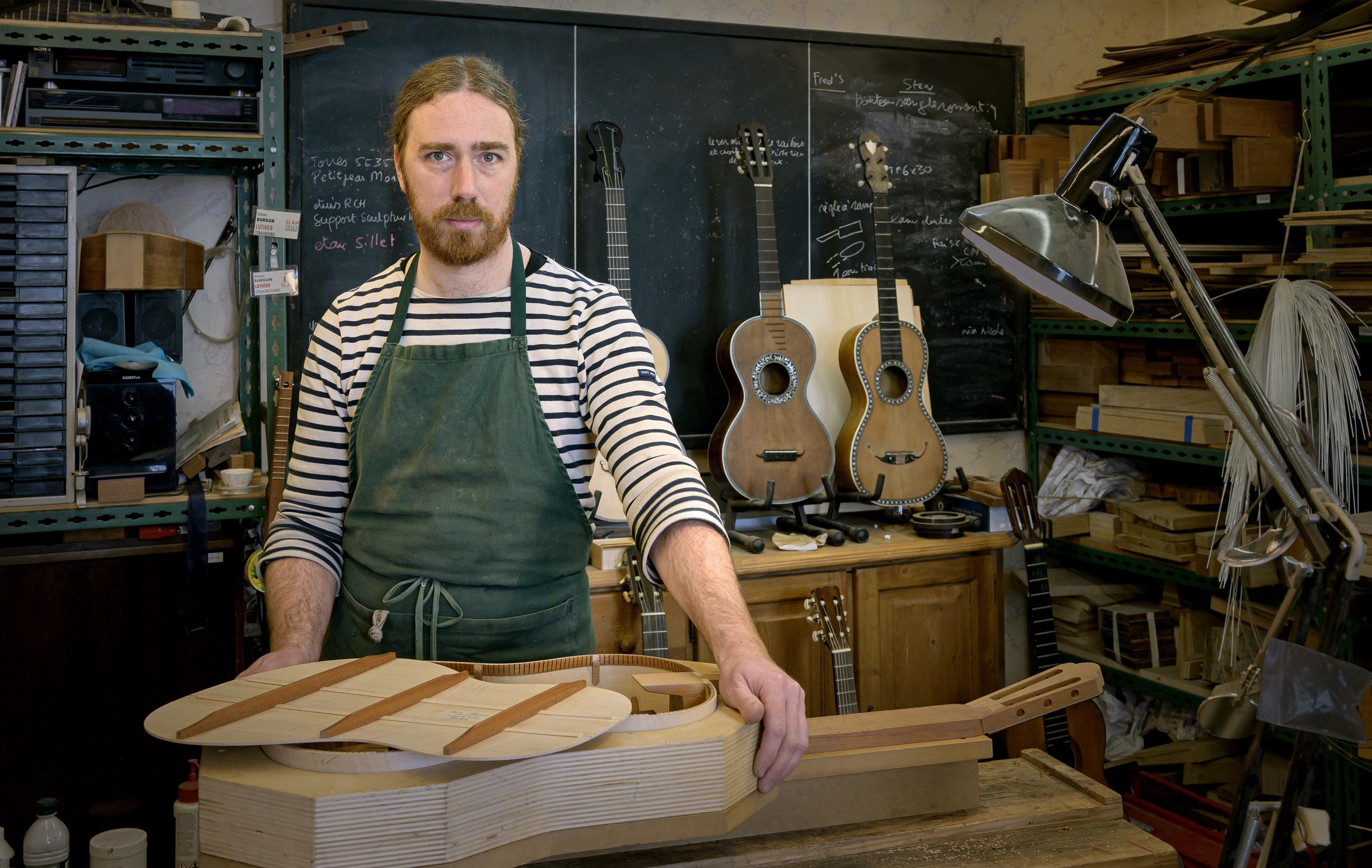 Pierre-Alexandre. Bellest – Estudié la guitarra de los 8 a los 18 años, pero me di cuenta que actuar en público dando conciertos no era mi vocación, como tampoco la enseñanza, pero me gustaban los trabajos manuales y comencé a interesarme en la fabricación de guitarras. En 2006, mi primer paso fue seguir un cursillo de Stephen Hill en Inglaterra. Construir mi primera guitarra fue una emoción inolvidable que me llevó a seguir los cursos del Newark Collegue también en Inglaterra. Al final de los