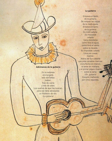 Empieza el llanto de la guitarra. Se rompen las copas de la madrugada. Empieza el llanto de la guitarra. Es inútil callarla. Es imposible callarla. Llora monótona como llora el agua, como llora el viento sobre la nevada. Es imposible callarla. Llora por cosas lejanas. Arena del Sur caliente que pide camelias blancas. Llora flecha sin blanco, la tarde sin mañana, y el primer pájaro muerto sobre la rama. ¡Oh, guitarra! Corazón malherido por cinco espadas.