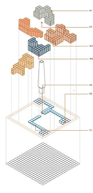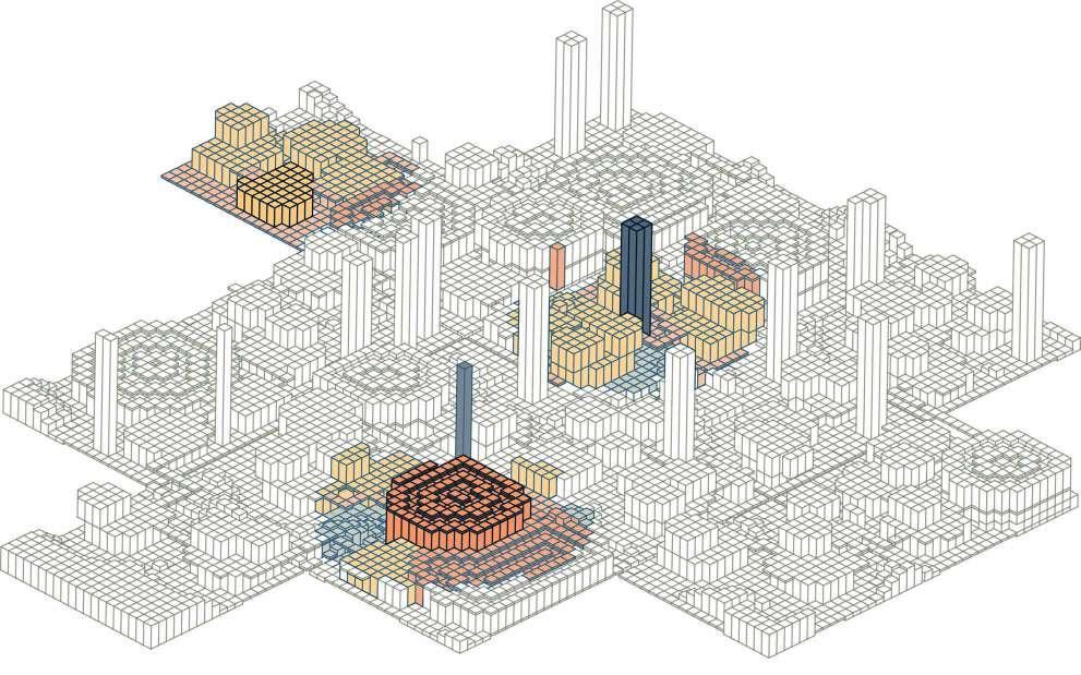 The resulting system bridges territorial, urban and architectural scales within a single computational structure. The term algebraic synthesis was coined to describe this methodology: an algorithmic process initiated through conventional architectural combinatorics, producing a “clash catalogue” of spatial relationships, which was then abstracted and extrapolated into a fully parametric and automated model of urban generation, which generates a multi-layered “clash matrix”.