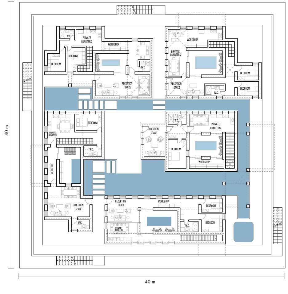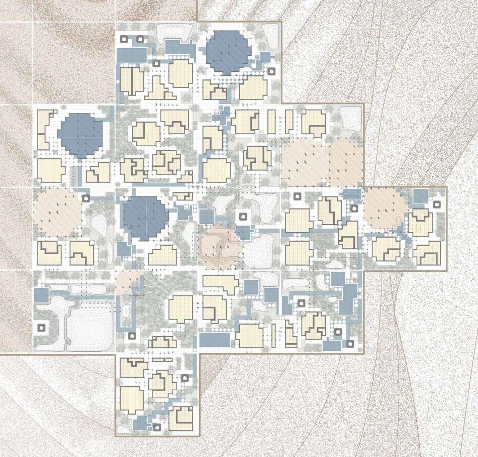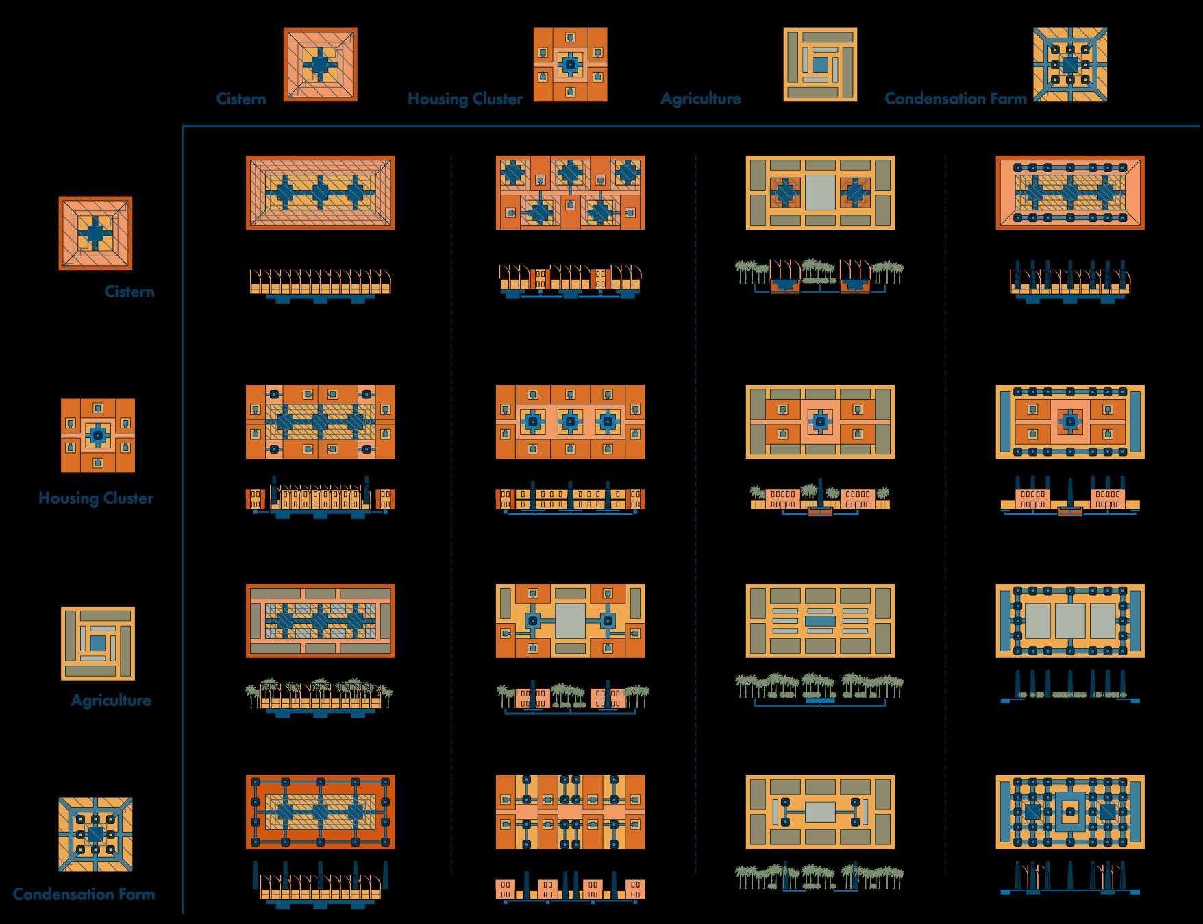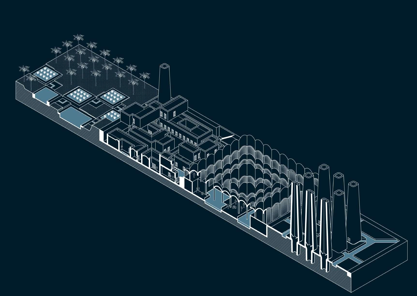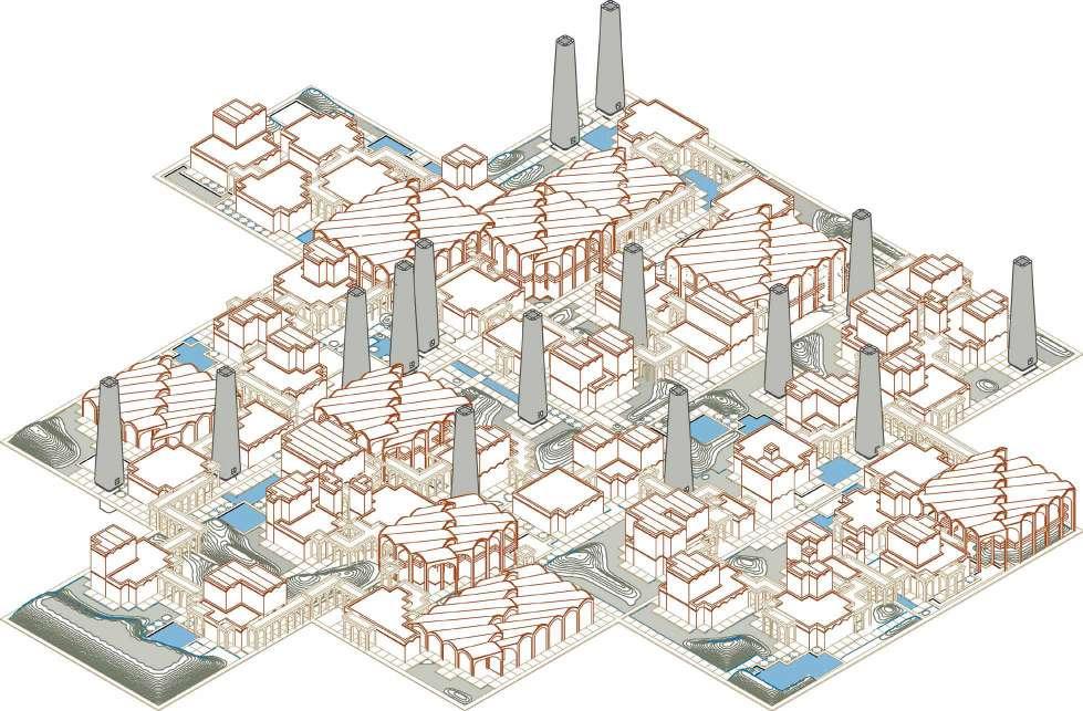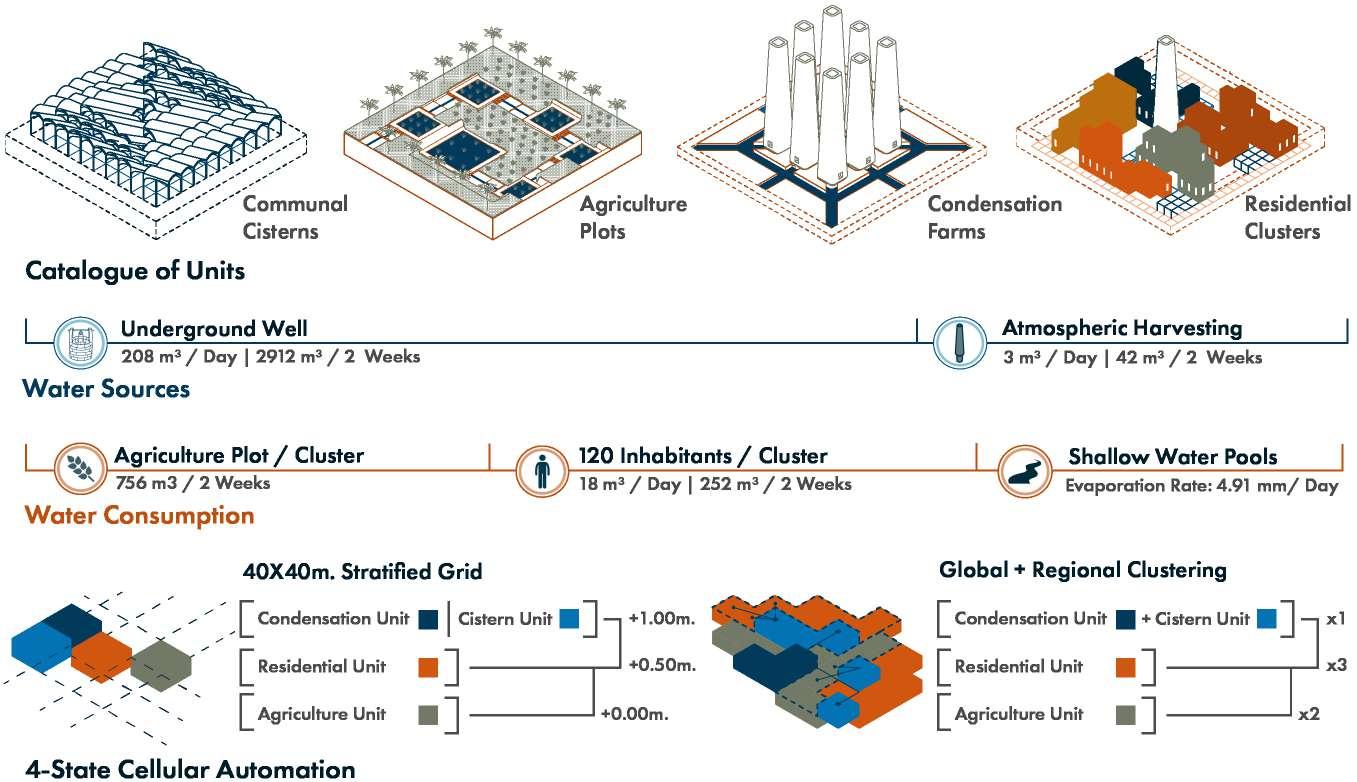These hydrological flows are computationally calibrated and embedded into the urban fabric through generative modelling, producing four interdependent typologies: housing clusters, communal cisterns, agricultural plots and condensation farms. Each typology is iterated through environmental simulation and informed by custom material systems and socio-economic parameters