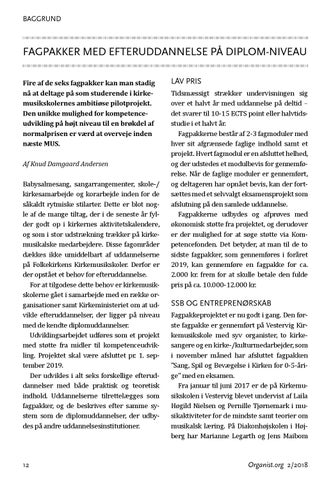 FAGPAKKER MED EFTERUDDANNELSE PÅ DIPLOM-NIVEAU Fire af de seks fagpakker kan man stadig nå at deltage på som studerende i kirkemusikskolernes ambitiøse pilotprojekt. Den unikke mulighed for kompetenceudvikling på højt niveau til en brøkdel af normalprisen er værd at overveje inden næste MUS. Af Knud Damgaard Andersen Babysalmesang, sangarrangementer, skole-/ kirkesamarbejde og korarbejde inden for de såkaldt rytmiske stilarter. Dette er blot nogle af de mange tiltag, der i de seneste år fylder godt op i kirkernes aktivitetskalendere, og som i stor udstrækning trækker på kirkemusikalske medarbejdere. Disse fagområder dækkes ikke umiddelbart af uddannelserne på Folkekirkens Kirkemusikskoler. Derfor er der opstået et behov for efteruddannelse. For at tilgodese dette behov er kirkemusikskolerne gået i samarbejde med en række organisationer samt Kirkeministeriet om at udvikle efteruddannelser, der ligger på niveau med de kendte diplomuddannelser. Udviklingsarbejdet udføres som et projekt med støtte fra midler til kompetenceudvikling. Projektet skal være afsluttet pr. 1. september 2019. Der udvikles i alt seks forskellige efteruddannelser med både praktisk og teoretisk indhold. Uddannelserne tilrettelægges som fagpakker, og de beskrives efter samme system som de diplomuddannelser, der udbydes på andre uddannelsesinstitutioner.