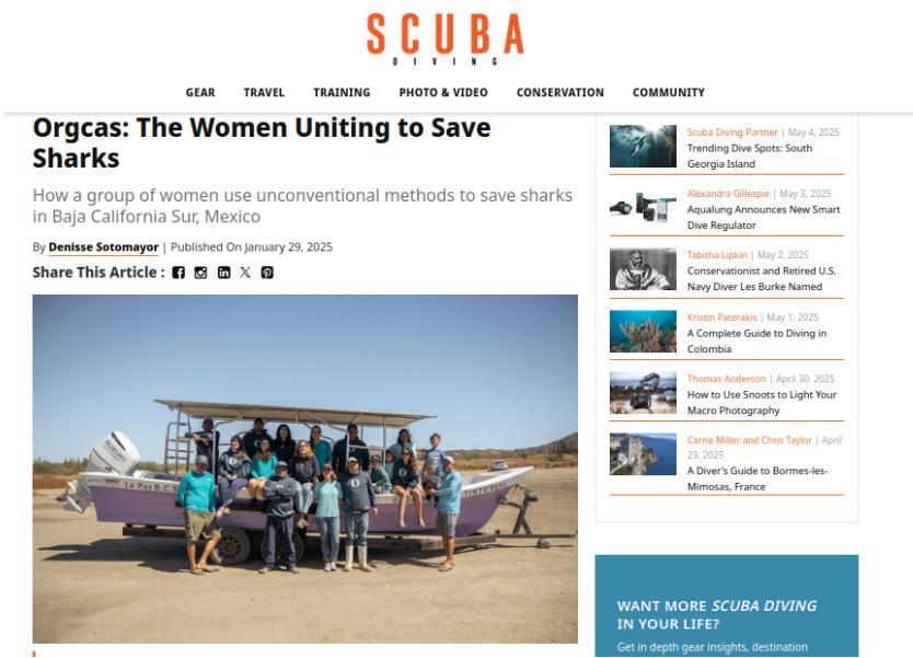 Another important highlight this month was the publication of the article “ORGCAS: Women Uniting to Save Sharks” in Scuba Diving magazine. The article emphasizes the role of women in leadership at ORGCAS and showcases our key actions in shark conservation in the Gulf of California. It highlights the impact of our research and conservation e orts, which aim to protect key species like sharks through a scientific, collaborative, and community-based approach. This kind of international media coverage significantly supports our mission and helps expand the visibility and backing of our marine protection initiatives.
