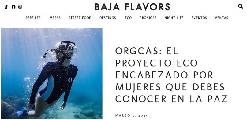 This month, ORGCAS’s work was featured in the article “ORGCAS: el proyecto eco encabezado por mujeres que debes conocer en La Paz” published by the digital platform Baja Flavors. The article highlights the women-led nature of the project, as well as the marine conservation, environmental education, and applied science e orts being carried out in the Gulf of California. This coverage helps increase visibility for the community-driven, interdisciplinary, and collaborative work promoted by ORGCAS and represents a valuable opportunity to expand our reach and strengthen communication with new audiences.