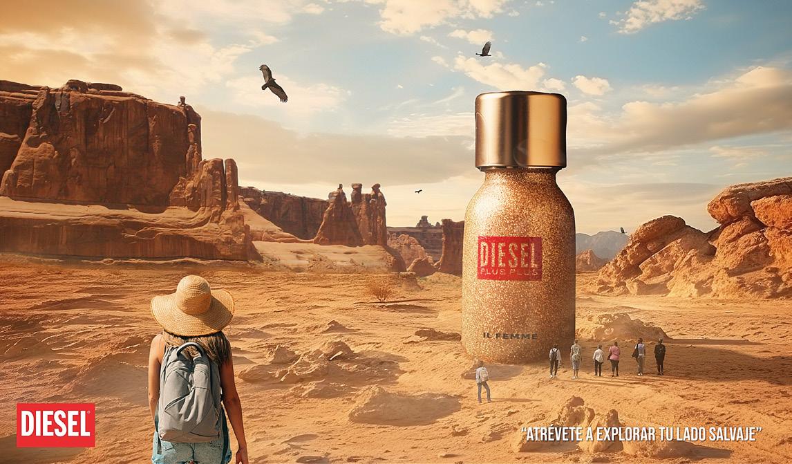 Esta composición desarrollada como parcial final del curso de Diseño Gráfico ‘Retoque Digital’, es una pieza publicitaria realizada en Photoshop con la técnica de Matte Painting. La imagen es impactante y simbólica, destacando el perfume Diesel Le Femme en un escenario de vasto desierto, rodeado de mujeres, lo cual le da una presencia monumental y casi mística. La protagonista, de espaldas, dirige la vista del espectador hacia la botella, mientras el paisaje cálido y rocoso, junto con aves en el cielo, evoca libertad y aventura.