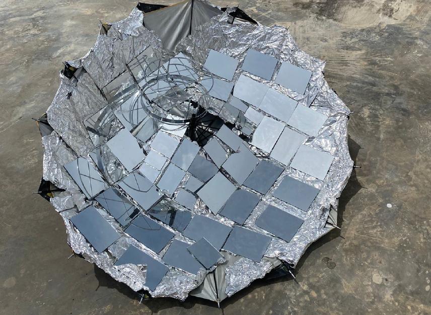Una cocina solar es un dispositivo colector solar que utiliza la energía del sol para poder cocinar alimentos mediante la refracción de los rayos solares, aunque las cocinas solares no son una idea novedosa reciente, estos han sufrido varias modificaciones a lo largo de los años Sin embargo, todavía hay espacio para mejoras con el fin de lograr una mayor eficiencia, menor costo, mayor portabilidad y mayor adaptabilidad a diferentes condiciones ambientales Se ha encontrado que existen tres tipos principales de cocinas solares y esas son: cocinas solares de caja, cocinas solares concentradas y cocinas solares indirectas (Lentswe, K , Mawire,A , Owusu, P, & Shobo,A 2021), dentro de estas se sabe que en cuanto a las cocinas solares indirectas, el uso de colectores solares de tubos de calor para calentar agua/aire, desalinización, etc Anivel doméstico e industrial está en progreso, pero falta con la cocina solar, esto crea un margen para desarrollar diseños de cocinas solares indirectas eficientes, portátiles, modulares, confiables y de bajo costo (Chilbule, P V, Dhole, L P, &Yewale, N M 2021) Para poder elaborar el prototipo se empleó el tipo de cocina solar parabólica, que entra en la categoría de cocinas solares de concentración, en el cual este proceso consta en Un plato parabólico con un diseño mejorado y soportado sobre una estructura resistente que permite la máxima absorción de la radiación solar sin necesidad de ningún operador humano (Singh, O K 2021), para esto se empleó un paraguas como base para que la cocina solar tome forma parabólica para luego forrarlo con papel aluminio para hacerlo funcional obteniendo el reflejo de los rayos solares, logrando que este se concentre en la parrilla y así este pueda calentar, mediante varias pruebas pudimos analizar que el tiempo de cocción se redujo considerablemente cuando se hicieron las modificaciones adecuadas a la forma del recipiente de cocción (Kumaresan, G., Vigneswaran, V S , Esakkimuthu, S , & Velraj, R 2016), así que en el proceso se hicieron muchas modificaciones en el diseño de la estructura de la cocina tales como: