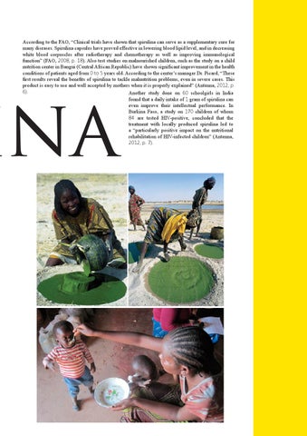 According to the FAO, “Clinical trials have shown that spirulina can serve as a supplementary cure for many diseases. Spirulina capsules have proved effective in lowering blood lipid level, and in decreasing white blood corpuscles after radiotherapy and chemotherapy as well as improving immunological function” (FAO, 2008, p. 18). Also test studies on malnourished children, such as the study on a child nutrition center in Bangui (Central African Republic) have shown significant improvement in the health conditions of patients aged from 0 to 5 years old. According to the center’s manager Dr. Picard, “These first results reveal the benefits of spirulina to tackle malnutrition problems, even in severe cases. This product is easy to use and well accepted by mothers when it is properly explained” (Antenna, 2012, p. 6). Another study done on 60 schoolgirls in India found that a daily intake of 1 gram of spirulina can even improve their intellectual performance. In Burkina Faso, a study on 170 children of whom 84 are tested HIV-positive, concluded that the treatment with locally produced spirulina led to a “particularly positive impact on the nutritional rehabilitation of HIV-infected children” (Antenna, 2012, p. 7).