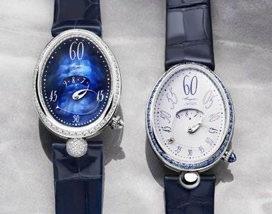 Là mẫu đồng hồ nổi tiếng của BREGUET chế tác dành cho nữ hoàng Caroline xứ Naples, năm nay hãng cho ra mắt hai phiên bản mới Reine de Naples có tham chiếu 9835 & 9838 của Breguet sở hữu kích thước vỏ 36,5mm x 28,45mm bằng vằng trắng 18K, cùng độ dày 11mm và khả năng chống nước dưới độ sâu 30m. Ref. 9835 nổi bật với nền màu xanh thẳm của đại dương, thể hiện nét sâu lắng ở những người phụ nữ trưởng thành và đặc biệt được tổ điểm bởi 161 viên kim cương. Còn với Reine de Naples 9838, mặt số khắc hoạ vẻ đẹp tinh khôi dưới sắc trắng nhẹ nhàng trầm lắng. Cả 2 “vị nữ hoàng” đều sở hữu bộ máy lên dây bằng tay 78A0, với mức dự trữ năng lượng trong vòng 40 giờ và tần số 3,5 Hz. Dây đeo bằng da cá sấu, trong khi khoá gập được nạm kim cương và ngọc bích.