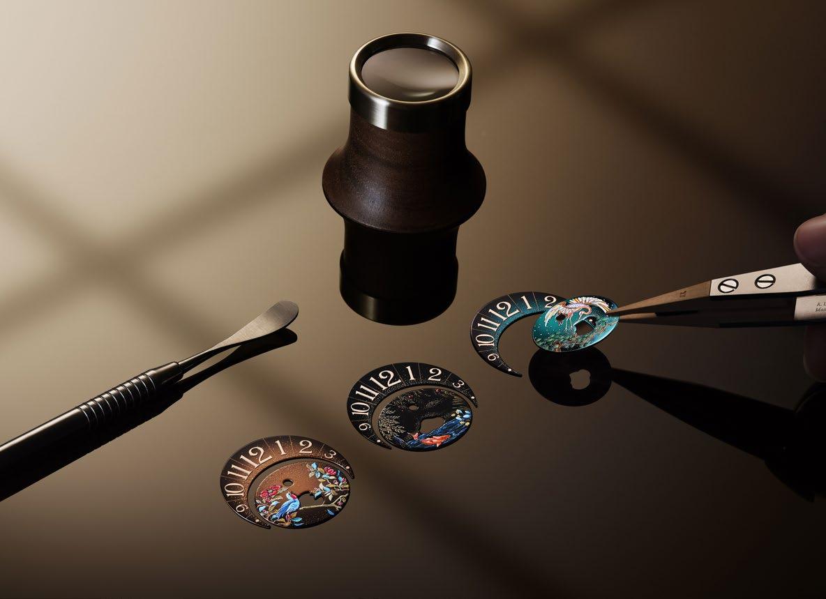 hoàn thiện trong thời kỳ Edo của Nhật Bản bằng cách rắc bột vàng hoặc những mảnh vàng lá lên sơn mài ướt để tạo hiệu ứng chuyển màu). Tiếp theo, tương tự như vẽ tranh sơn dầu trên canvas nhưng ở quy mô cực nhỏ, hình ảnh được vẽ theo từng nét cọ siêu nhỏ - một quá trình mất khoảng 35–40 giờ làm việc chăm chỉ và tập trung cao độ. Ở bước hoàn thiện cuối cùng, các yếu tố trang trí cho ba linh vật chính được tôn vinh bằng các hạt (vảy) vàng nhỏ. Mang lại cảm giác chuyển động và chiều sâu thị giác đáng kinh ngạc, mỗi một tác phẩm nghệ thuật thu nhỏ này đều thấm nhuần cá tính và niềm đam mê của người nghệ nhân thực hiện. Cuối cùng, nhiều lớp sơn mài trong và mờ sẽ được phủ lên để “khóa” bức tranh bên dưới một lớp bảo vệ trong suốt vĩnh cửu. Cầu kỳ là thế nên không ngạc nhiên khi Jaeger-LeCoultre chỉ sản xuất giới hạn 10 chiếc đồng hồ cho mỗi phiên bản.