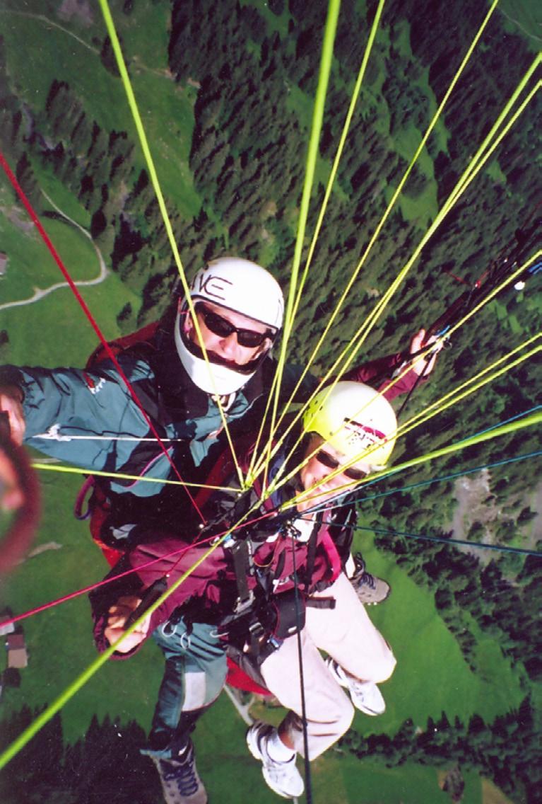 ARRIVING in Grindelwald late afternoon after a spectacular bus ride the first thing I did was open our hotel window. What a sight! Paragliders in brilliant colour floating in the sunshine right there in front of me. I decided I needed an adrenaline pump. “That’s what I am going to do tomorrow on our ‘rest day’.” An hour or so later, encouraged by John Sheahan (but not to fly himself), we wandered over to check out the options. The information office had just closed but my luck was in. We met Benny, one of the pilots, on his way home. Benny, it turned out, was an elite Swiss orienteer who was not orienteering this year as he has had knee surgery. He had even been in Australia in the early 80’s assisting with the juniors in NSW. What an auspicious start. It was arranged. I booked for 4.30pm the next day when the thermals are good. That night back at dinner I canvassed for some other intrepid orienteers. Is it that I am not a good salesman or are orienteers glued to the ground? Tony from England was my only starter. After a day of general sightseeing Tony and I (and Mary Enter who came for moral support) duly met Benny and Alan, our two pilots, at the base of the cable car. We rode up three stages to arrive at the top of the ski slope at about 3000 metres and a magnificent view of the snow capped mountains surrounding a beautiful green valley with the town of Grindelwald below. Benny and Alan said “just go and have a sit down for a while as the wind is not from the right direction, we may have to lift off from a different site”. After about ten minutes they came back to say get ready, the wind may come around to the right direction and we need to be ready for the right moment. Benny laid the paraglider sail out on the ground on a grassy (steepish) slope below the trig point, strapped us both into our harnesses, gave me some last minute instructions and we waited for the wind to shift. Only then did I get nervous. There were four tandem paragliders ready to go. Suddenly I was told to run. Well, it was more like a drunken stagger, as the wind filled the chute from a slightly different direction but quicker than I ever imagined we were suddenly in mid-air soaring above the mountains. What a magnificent feeling. Free as a bird. What were those ant-like creatures below there? See that slope over there, that’s where we were orienteering yesterday, it doesn’t look that intricate. What about that snow at eye level over the other side of the valley, that’s where there was a snow slide yesterday. I can see the train line. Is that our hotel down there? What a buzz. When I gained confidence to let go I tried to take a video but found out later that I hadn’t pressed the record button. I did take a couple of still photos but Benny had a camera on a telescopic pole so I can really prove that I did it. He even gave me the ‘controls’ and I was impressed by how inherently stable the paraglider is. Much safer than a hang glider and able to pick up thermals and ascend unlike say a parachute. After many circuits and soaring in thermals, 25 minutes later we started to come in to land and I could recognize Jenny and John Sheahan waiting amongst the ‘ants’. We began to descend and my instructions were to stand up on landing. I don’t know why but it seemed much more sensible to sit so I can’t say it was the most gracious landing but we were down. Reality again - oh well, there’s always more orienteering to follow.