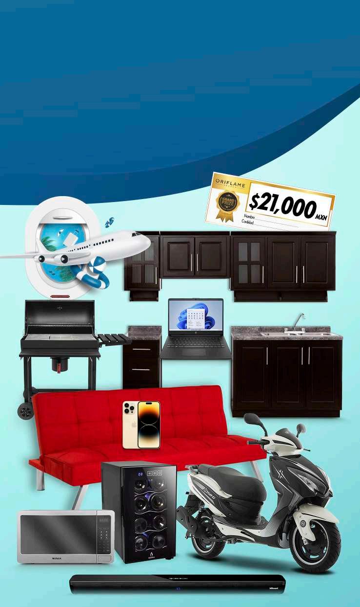 1. Bono de $21,000 pesos mexicanos / 2. iPhone 14 Pro Max / 3. Galaxy S23+ / 4. Smart TV de 75 pulgadas / 5. Viaje internacional de 4 días – 3 noches / 6. Motoneta Italika