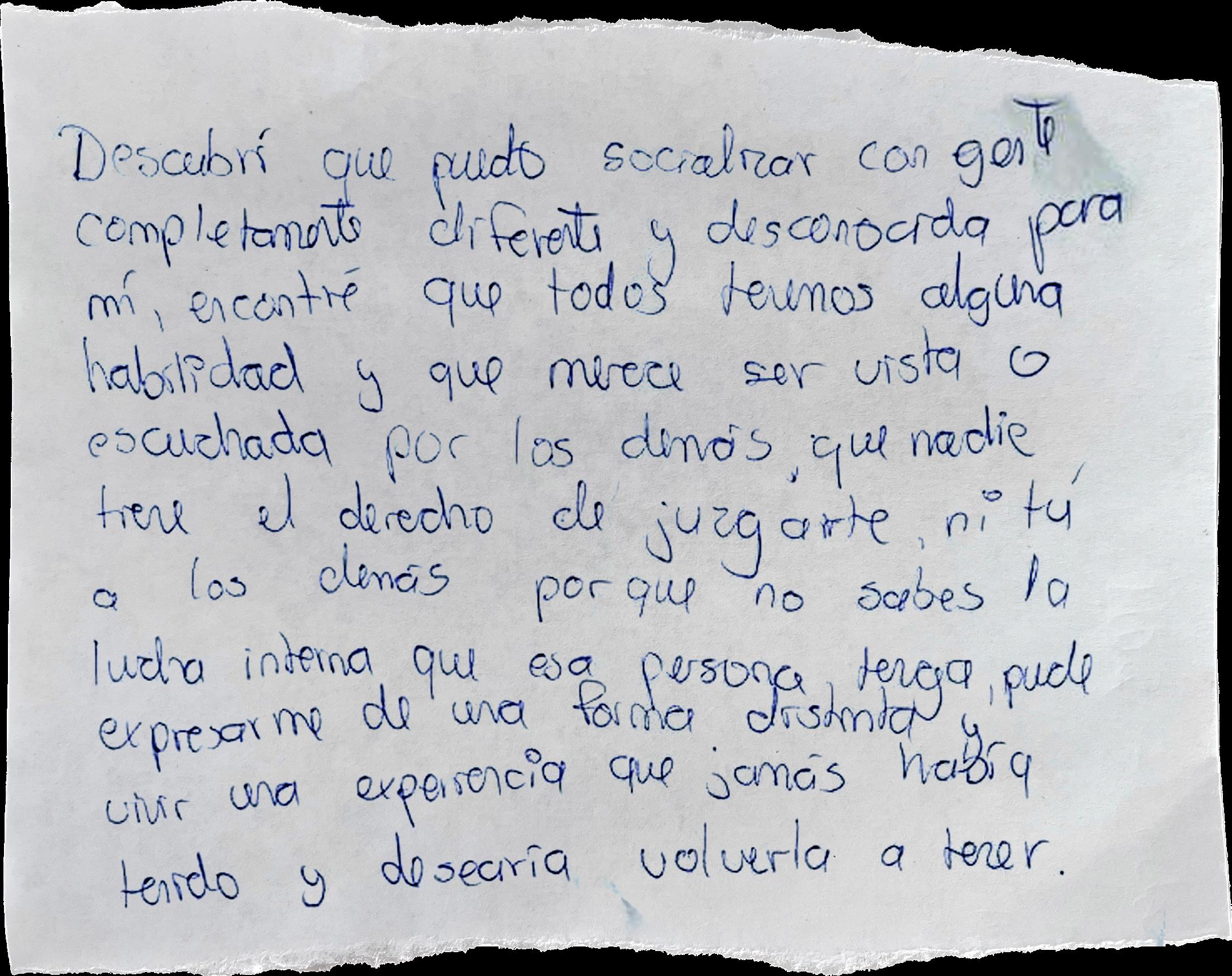 “Scholas me ha permitido por medio del programa Estar Juntos aprender el sentido y el valor del encuentro con los otros en general, pero sobre todo con los adultos mayores. Me ha enseñado que con ellos formamos el presente y que su experiencia de vida tiene mucho que aportarle a mi juventud y a mi búsqueda de sentido. La cultura del encuentro que he experimentado en Estar Juntos me ha llevado a actos concretos: a cantar, a contar historias, a llorar, a divertirme o simplemente a estar con un amigo 50 o 60 años mayor que yo.”