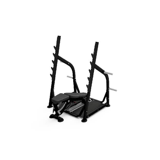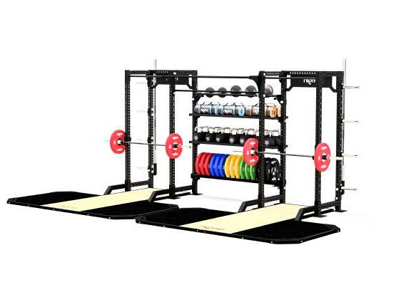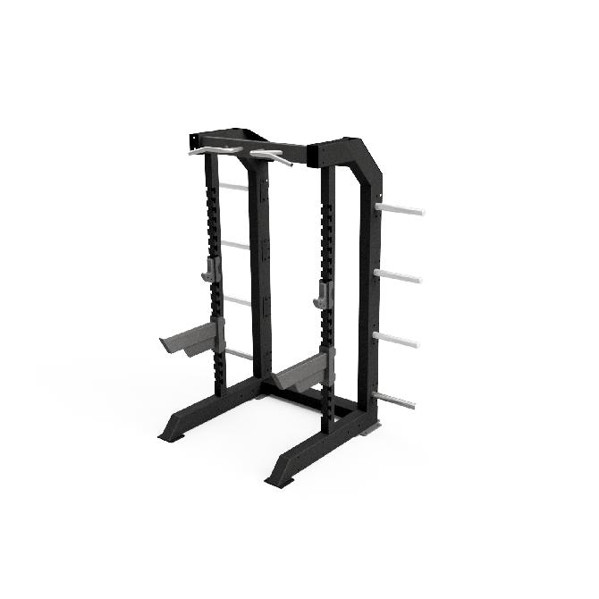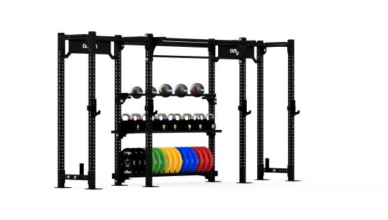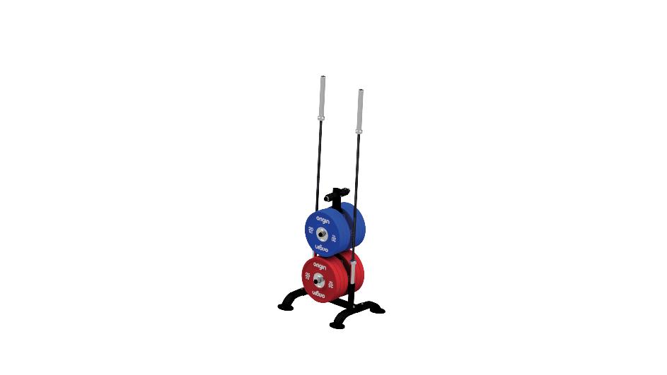 The Weight Tree design has been modified to decrease the number of dedicated pegs for bumpers to 4. This allows for the extended frame to store 2 Olympic bars, with the third pair of weight pegs reserved for either incremental or weight collars.