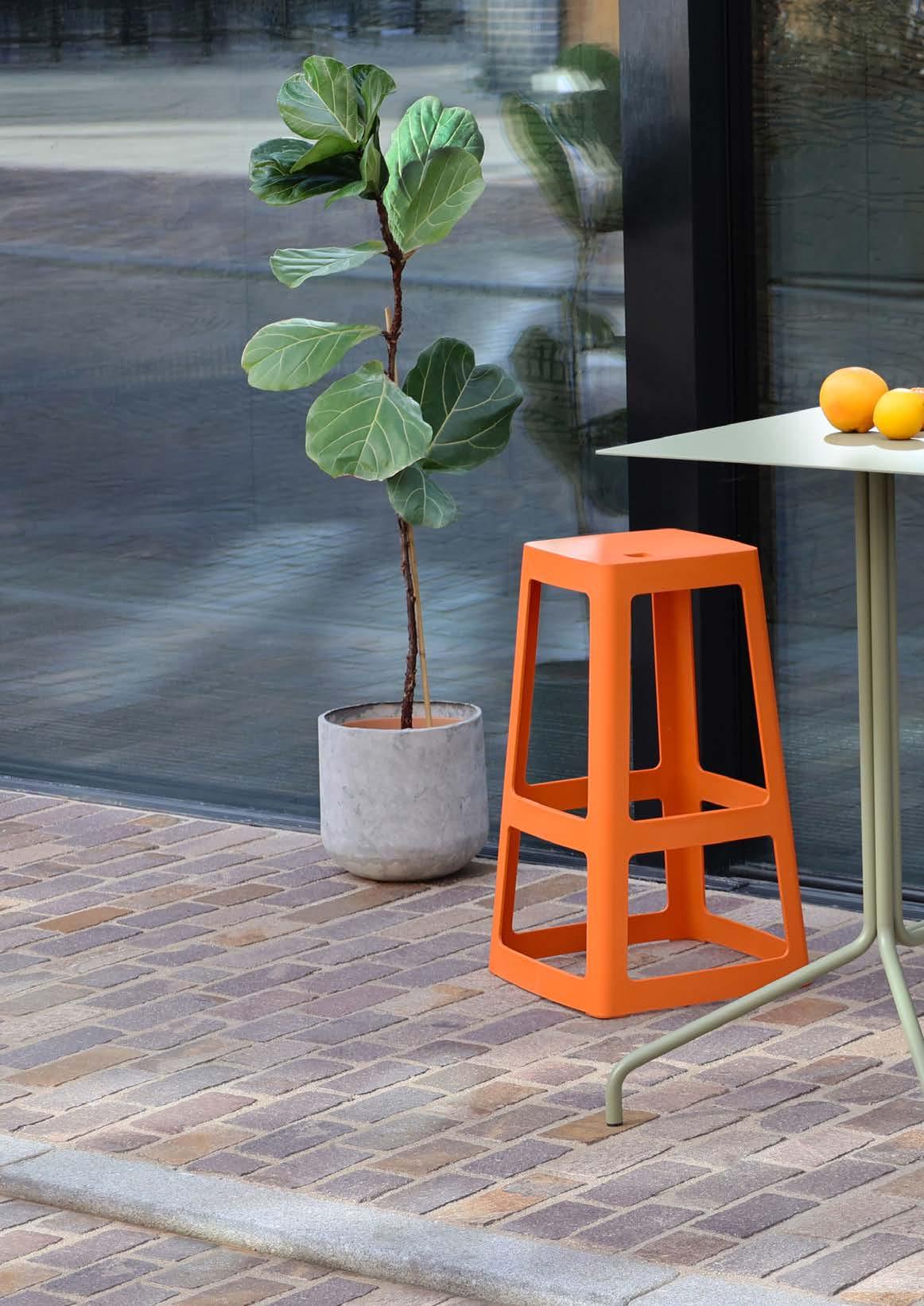 Product: Vine High Table Wide, Base High Stool. Colour: Reed Green, Red Orange.