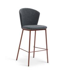 Die schlanken, gebogenen Linien der Rückenlehne werden von einem Massivholzrahmen in weich abgerundeten Formen eingefasst, die ein angenehmes Gefühl und attraktive Kontinuität zwischen Gestell und Beinen vermitteln. Diese konstruktive Lösung wird zum prägenden Element einer kompletten Linie von stapelbaren Stühlen, von Armstühlen, Hockern, Sesseln – mit oder ohne Armlehnen –, kleinen Sofas: Alle können in den Bezügen und Farben individuell gestaltet werden.