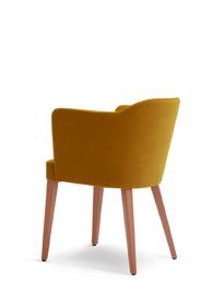 The slim, arched lines of the backrest are outlined by with a solid wood frame, with softly rounded shapes, creating a warm feeling and a sense of continuity with structure and legs. This construction is a distinctive feature of a complete range of stacking chairs, large and small armchairs, stools, slipper chairs and compact sofas, all with customisable coverings and finishes.