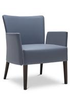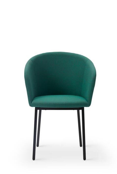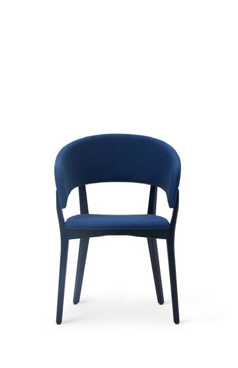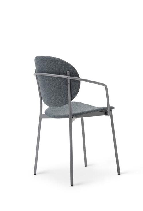 Die schlanken, gebogenen Linien der Rückenlehne werden von einem Massivholzrahmen in weich abgerundeten Formen eingefasst, die ein angenehmes Gefühl und attraktive Kontinuität zwischen Gestell und Beinen vermitteln. Diese konstruktive Lösung wird zum prägenden Element einer kompletten Linie von stapelbaren Stühlen, von Armstühlen, Hockern, Sesseln – mit oder ohne Armlehnen –, kleinen Sofas: Alle können in den Bezügen und Farben individuell gestaltet werden.