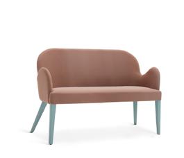 Prägendes Element dieser Linie ist das Holzgestell, in das eine körpernahe Rückenlehne eingesetzt ist; die angewendete, technische Lösung bestätigt die hochwertige Konstruktion und Sorgfalt in jedem Detail. Die beiden Modelle unterscheiden sich in der Rückenlehne: wie ein gemütliches, schützendes Nest bei Nesta, offen und schwebend bei Velia, wo sich visuelle Leichtigkeit und praktische Handhabung zum Verschieben und Reinigen des Sitzmöbels verbinden.