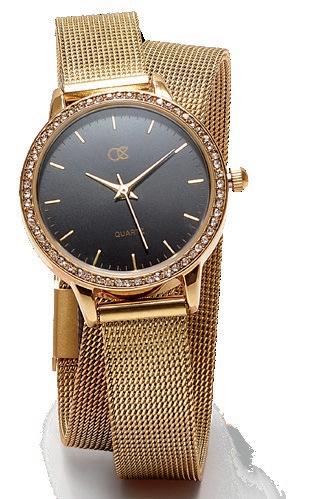 Combinación perfecta entre pulsera y reloj. Extensible tipo pulsera de malla metálica ajustable. Elegante esfera estilo pavé con fondo negro a contraste y marcadores dorados.