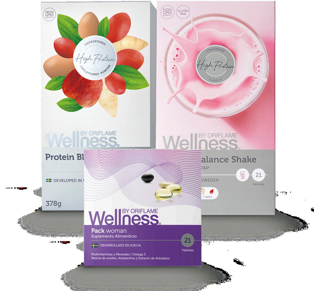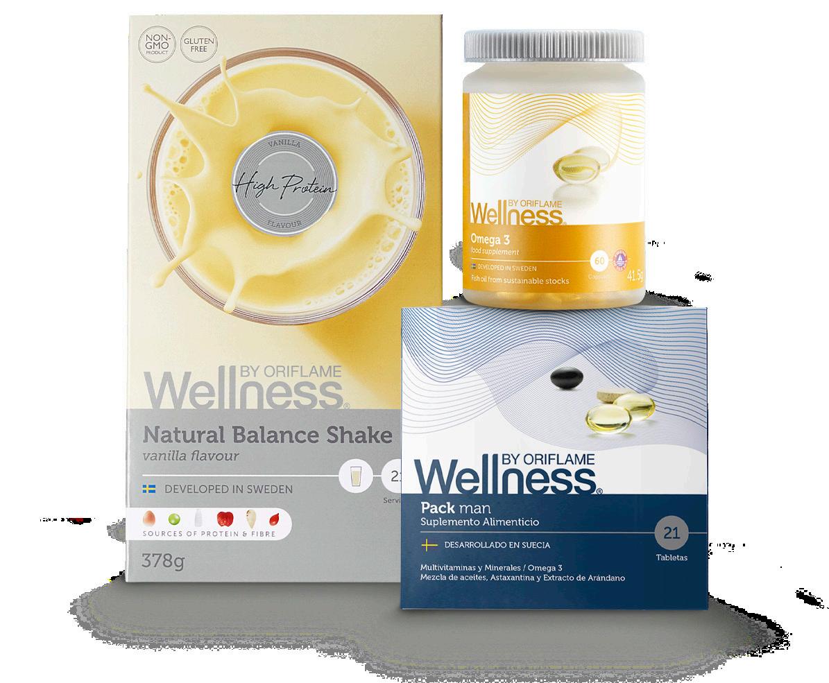 WELLNESS 31 LOS PRODUCTOS WELLNESS DAN 20% MÁS PUNTOS Sistema Nutrición Promoción válida por cada unidad de estos códigos. 2 Este producto no es un medicamento. 1Este producto no sustituye una alimentación balanceada. INCLUYE: • Batido Natural Balance (Vainilla/Hombre - Frutilla/Mujer)1 • Wellness Pack (Hombre-Mujer)2 • Vaso Mezclador con Cuchara Medidora • Díptico Rutina ABC Wellness by Oriflame • Caja de Regalo 802118 Rutina ABC para Ella Batido Frutilla + Wellness Pack 802119 Rutina ABC para Él Batido Vainilla + Wellness Pack GANANCIA $23.010 PRECIO EXCLUSIVO * Precio Catálogo: $73.000 $49.990 Puntos: 90 PACK HOMBRE 802134 Pack + 2 Frutilla. 802135 Pack + Frutilla + Vainilla. 802136 Pack + Frutilla + Chocolate. 802137 Pack + 1 Natural + 1 Frutilla. 802141 Pack + 2 Vainilla. 802142 Pack + Vainilla + Chocolate. 802143 Pack + 1 Natural + 1 Vainilla. 802146 Pack + 2 Chocolate 802147 Pack + 1 Natural + 1 Chocolate. 802149 Pack + 1 Natural + 1 Natural.. PACK MUJER 802130 Pack + 2 Frutilla. 802131 Pack + Frutilla + Vainilla. 802132 Pack + Frutilla + Chocolate. 802133 Pack + 1 Natural + 1 Frutilla. 802138 Pack + 2 Vainilla. 802139 Pack + Vainilla + Chocolate. 802140 Pack + 1 Natural + 1 Vainilla. 802144 Pack + 2 Chocolate. 802145 Pack + 1 Natural + 1 Chocolate. 802148 Pack + 1 Natural + 1 Natural. 2 Batidos Natural Balance1 + 1 Suplemento Alimenticio2 o 1 Polvo Protein Blend1 + 1 Batido Natural Balance1 + 1 Suplemento Alimenticio2 GANANCIA $32.010 PRECIO EXCLUSIVO * Precio Catálogo: $104.000 $71.990 Puntos: 129 RUTINA