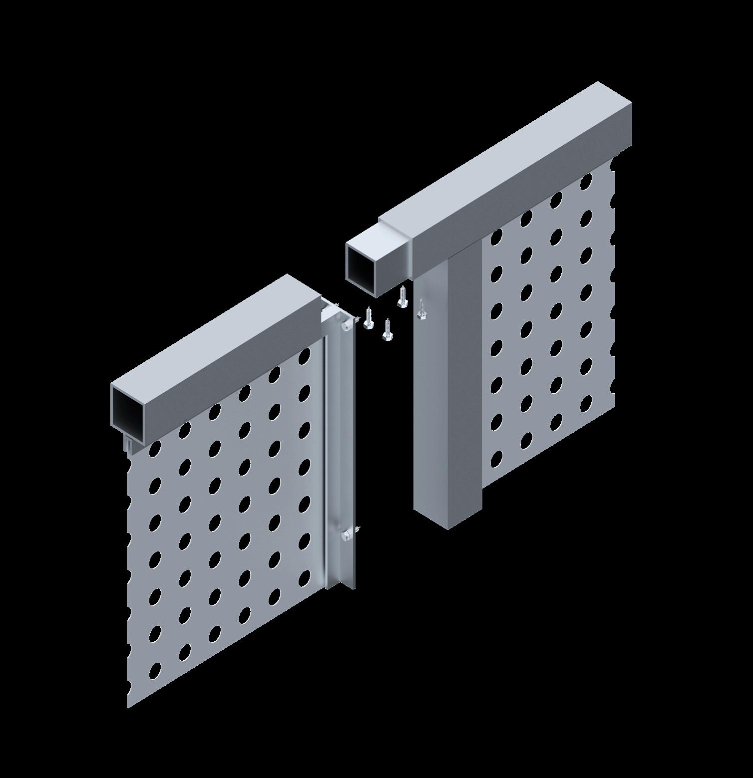 To secure the panels to the posts, a flat bar is employed, which acts as a mechanical connection. This flat bar is bolted to the posts, creating a robust framework that holds the perforated panels firmly in place. The perforations in the metal not only enhance visibility and airflow but also contribute to a lightweight design. Overall, this combination of splicing and mechanical fastening provides a reliable and visually striking solution for railings in various architectural applications.