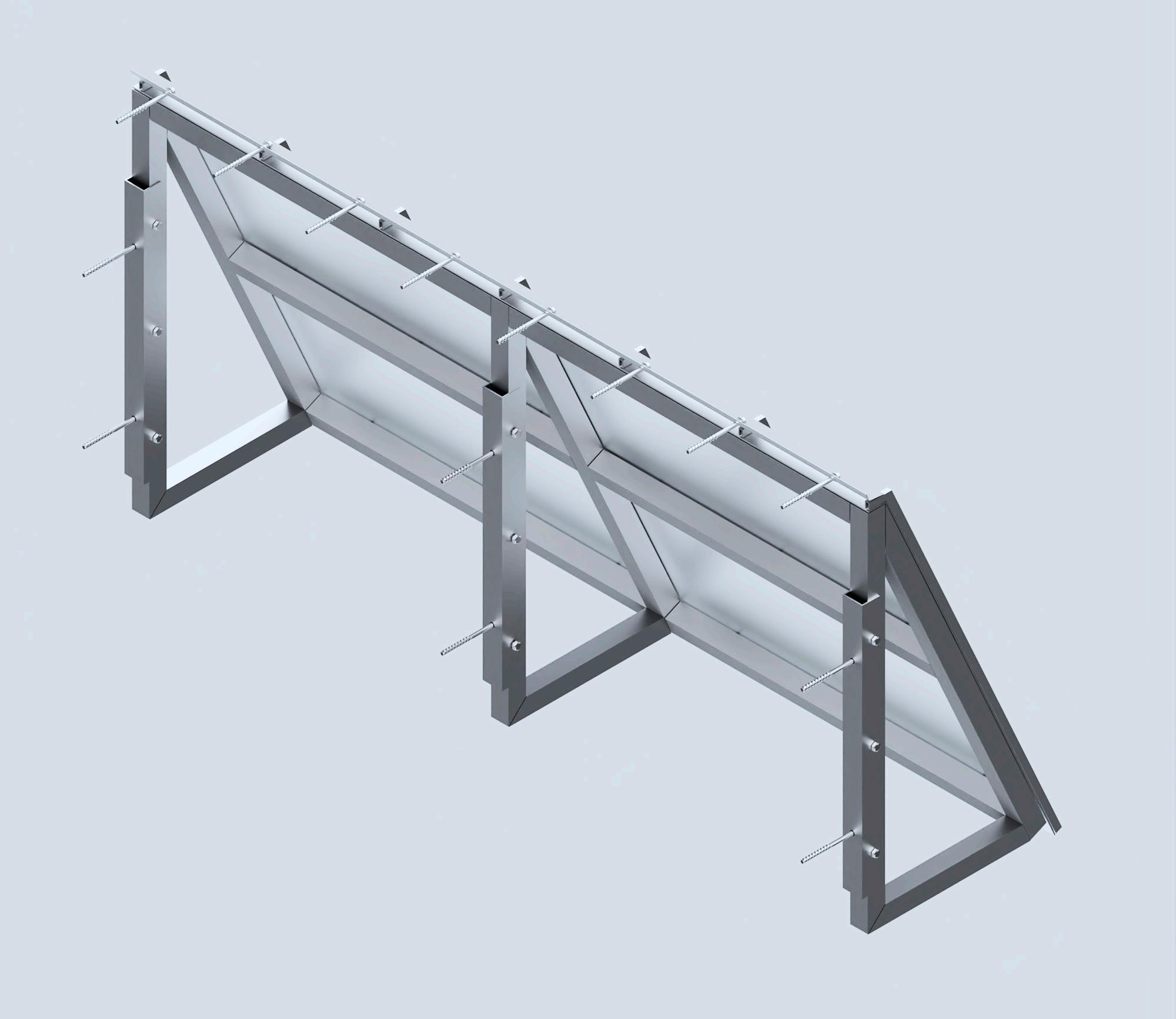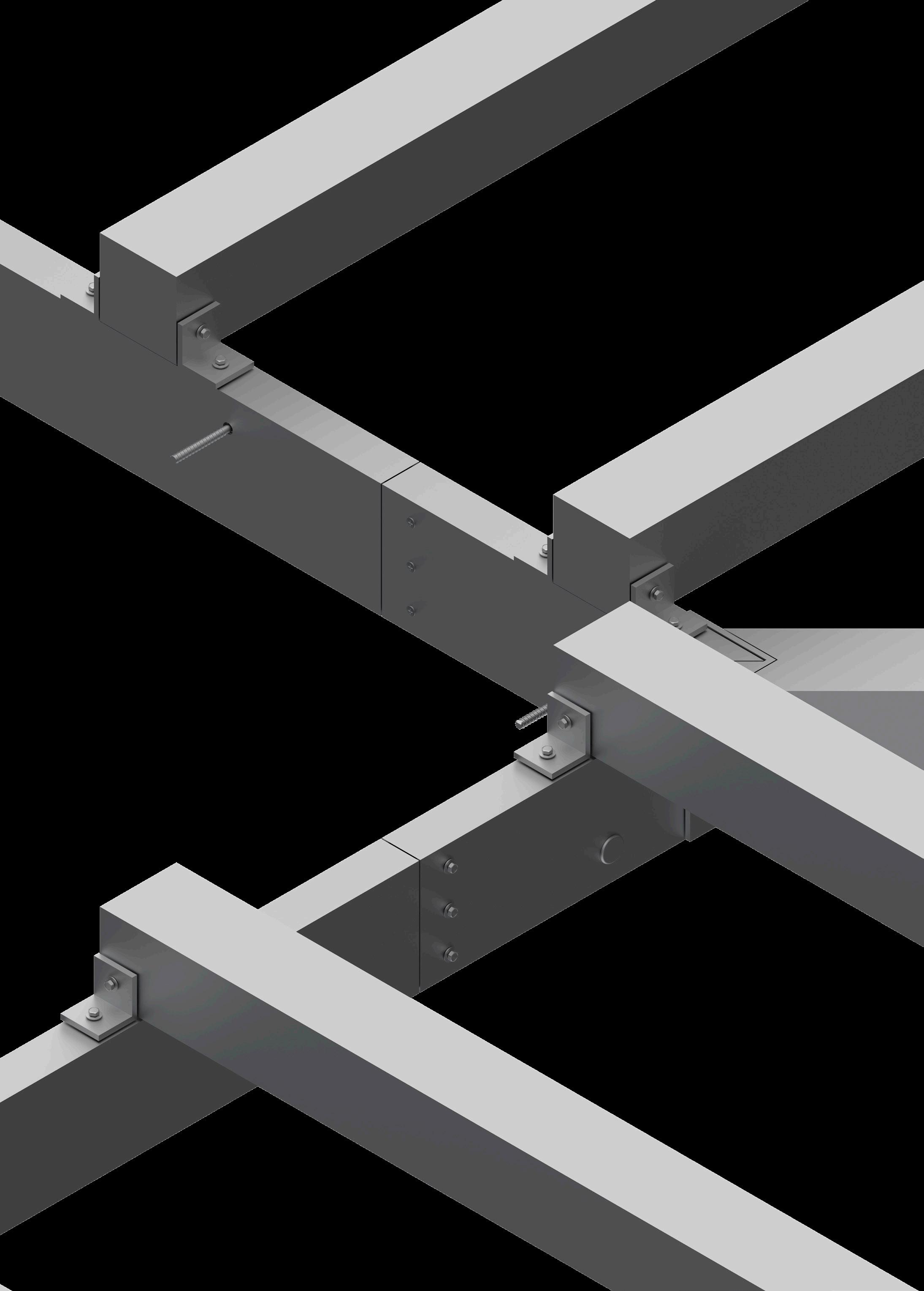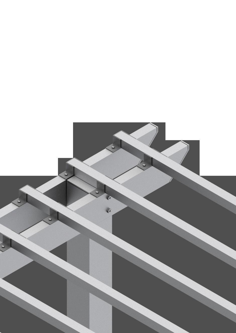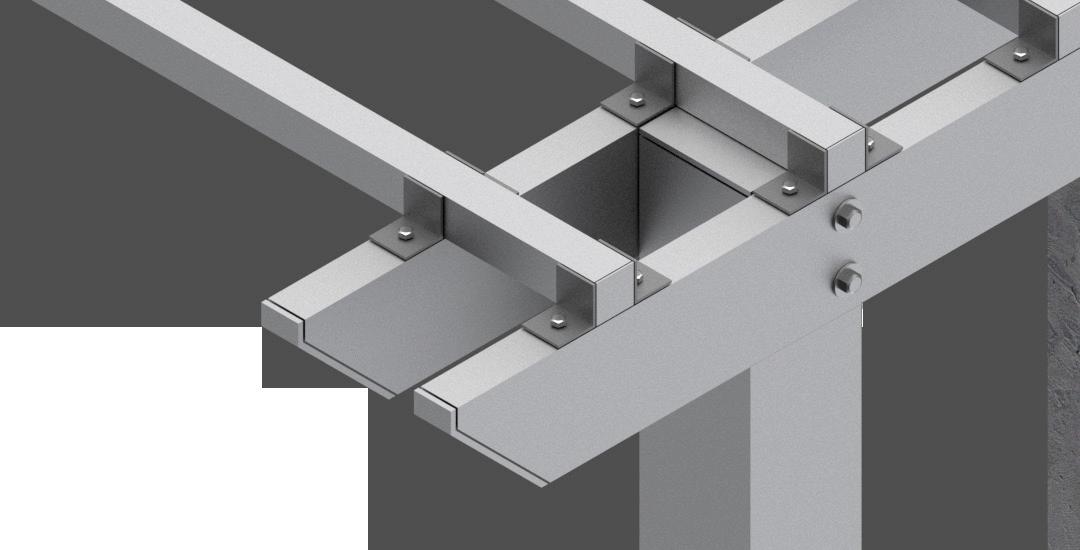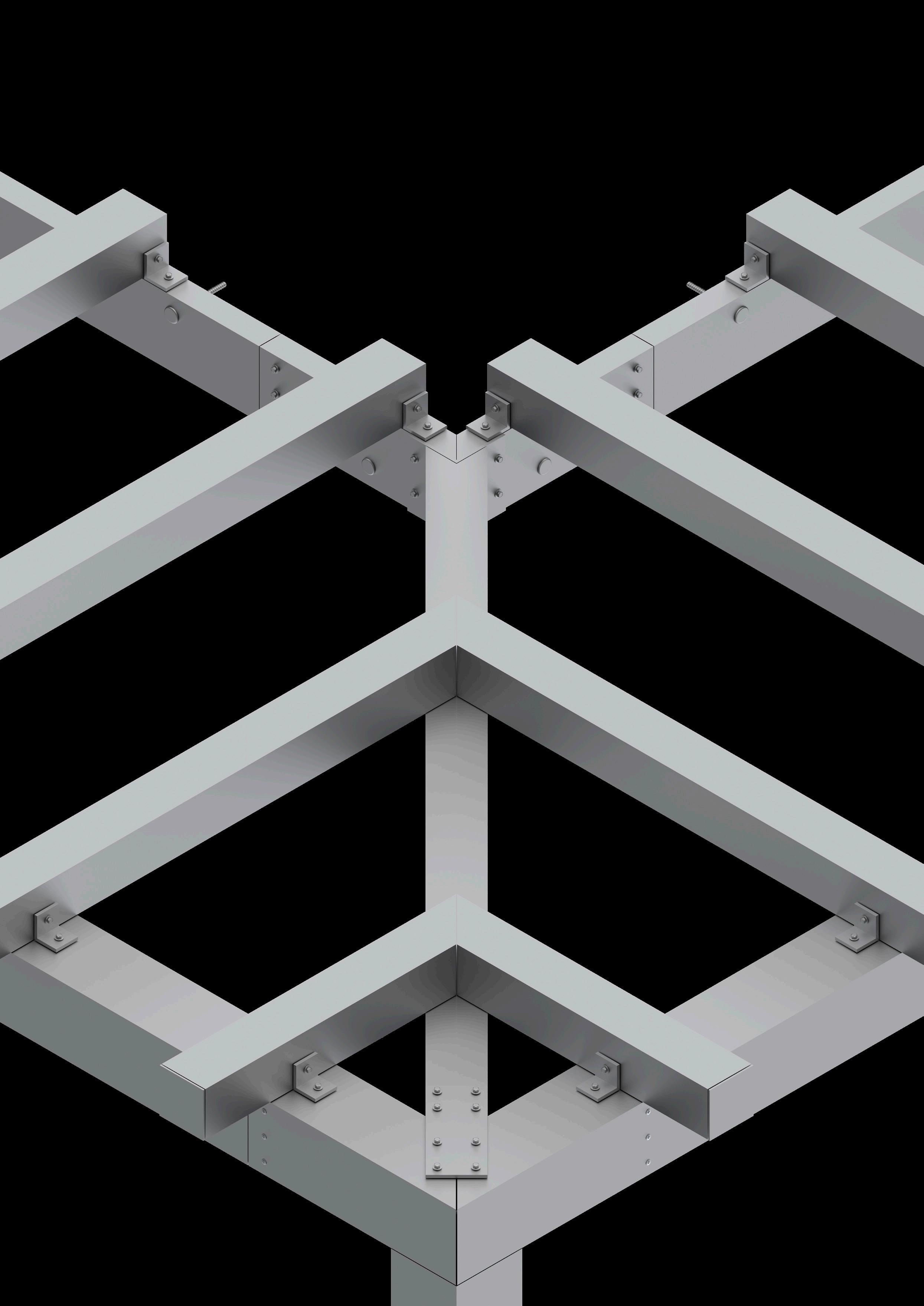A render provides a detailed view of the mechanical joints in an aluminum trellis, helping to illustrate the precise alignment of angles and screws.