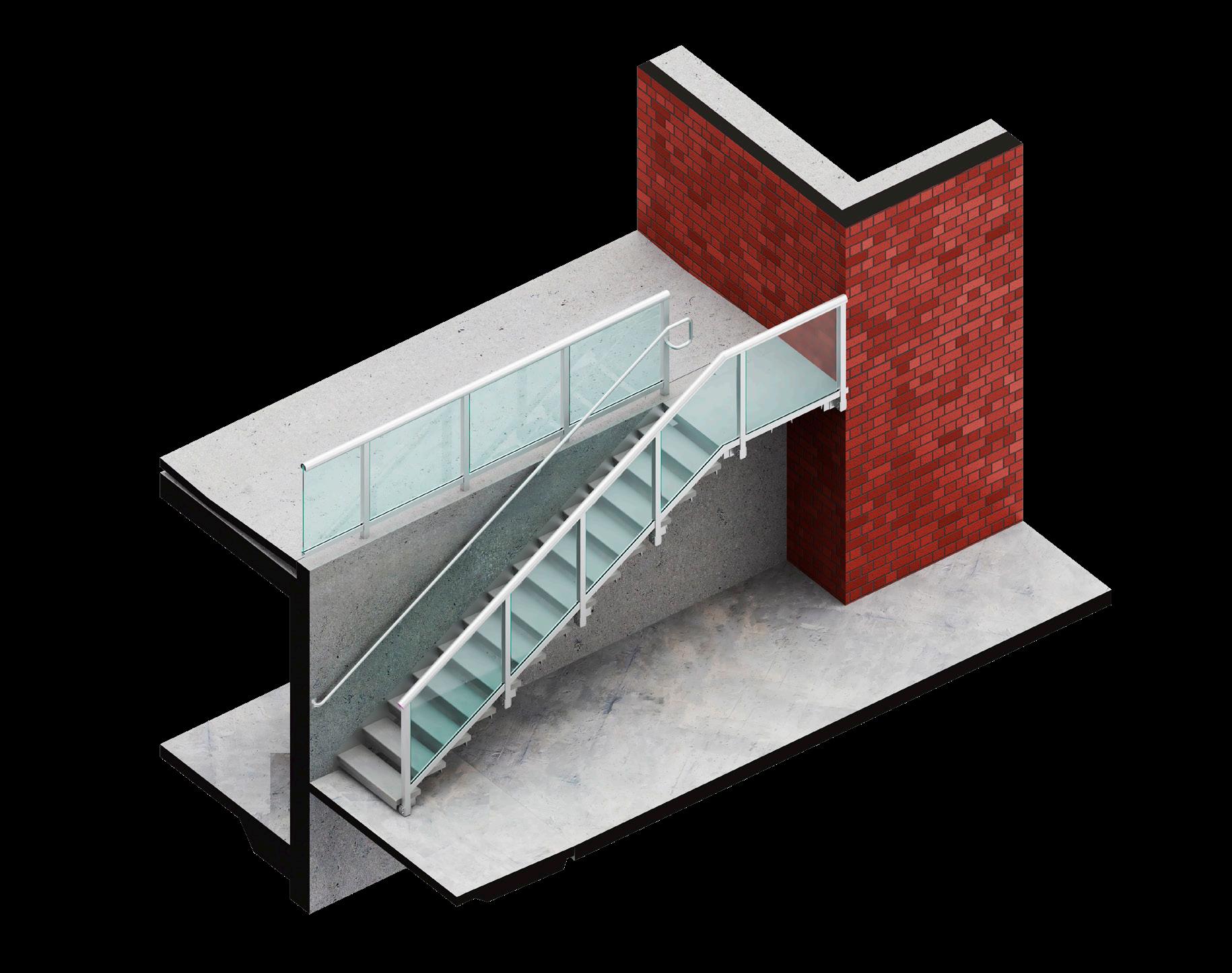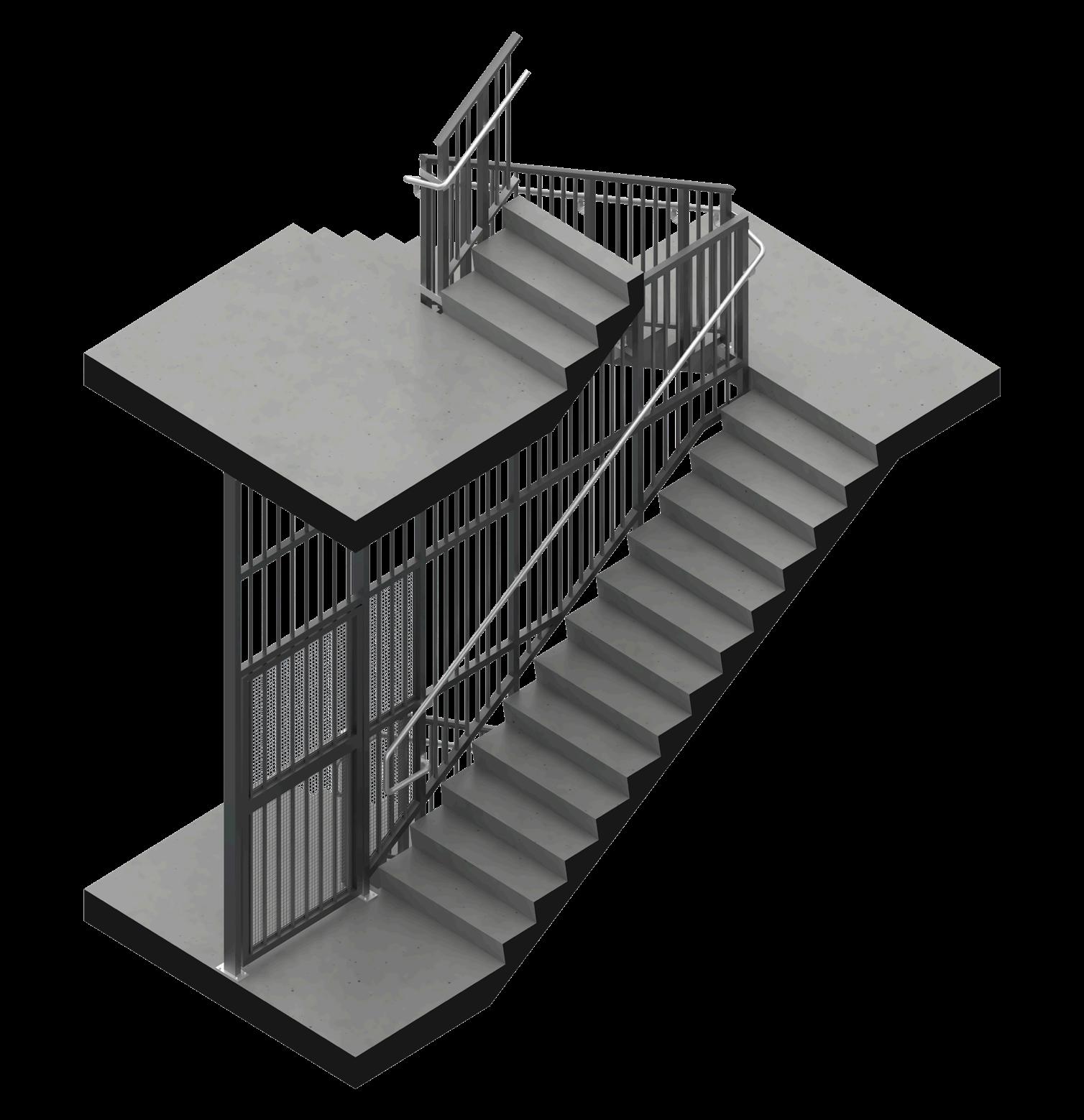 The aluminum railing in these staircases includes several key parts to ensure safety and functionality. The handrail, which runs along the railing, offers additional support for users when ascending or descending the stairs.
