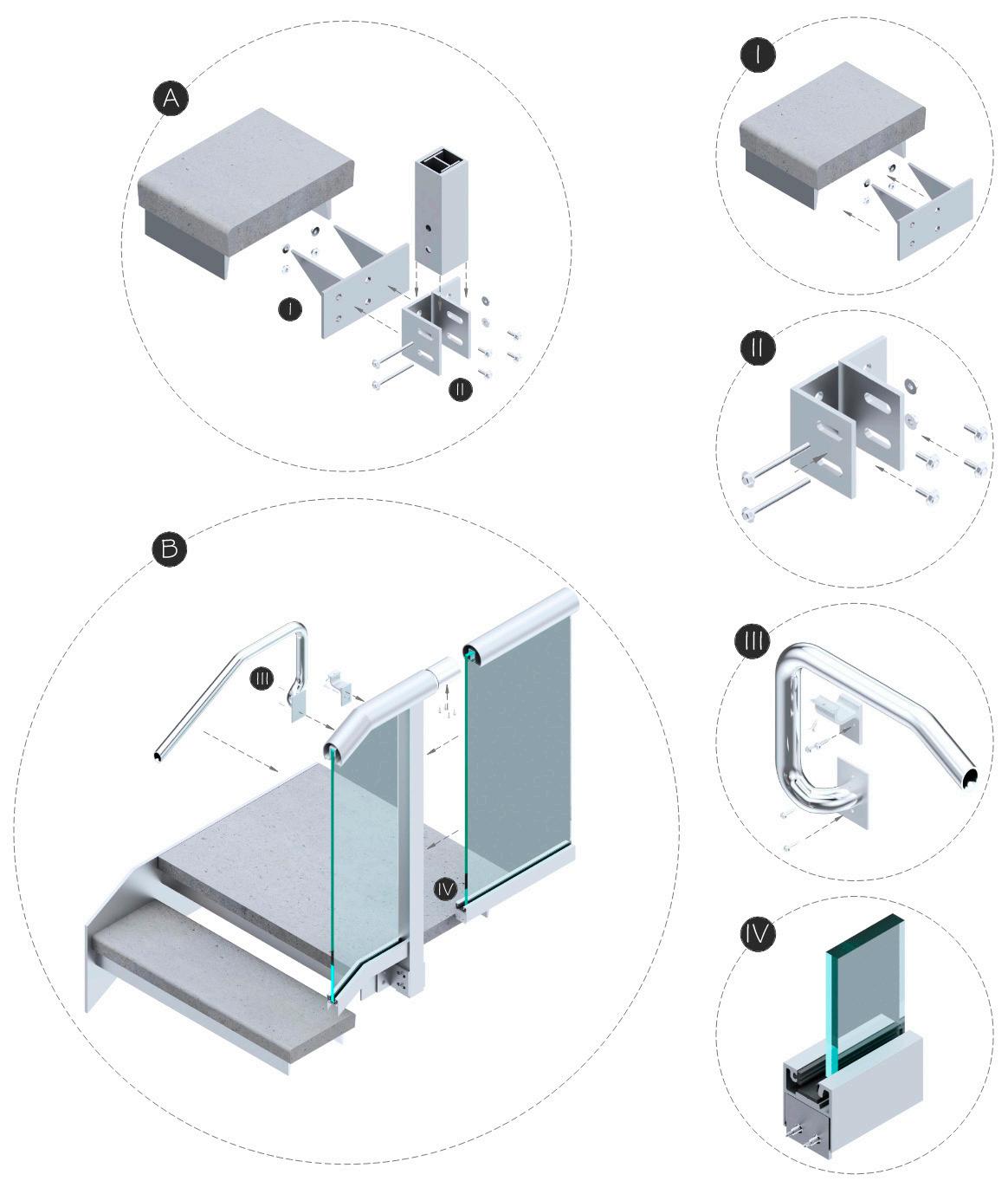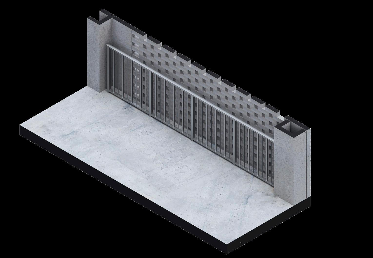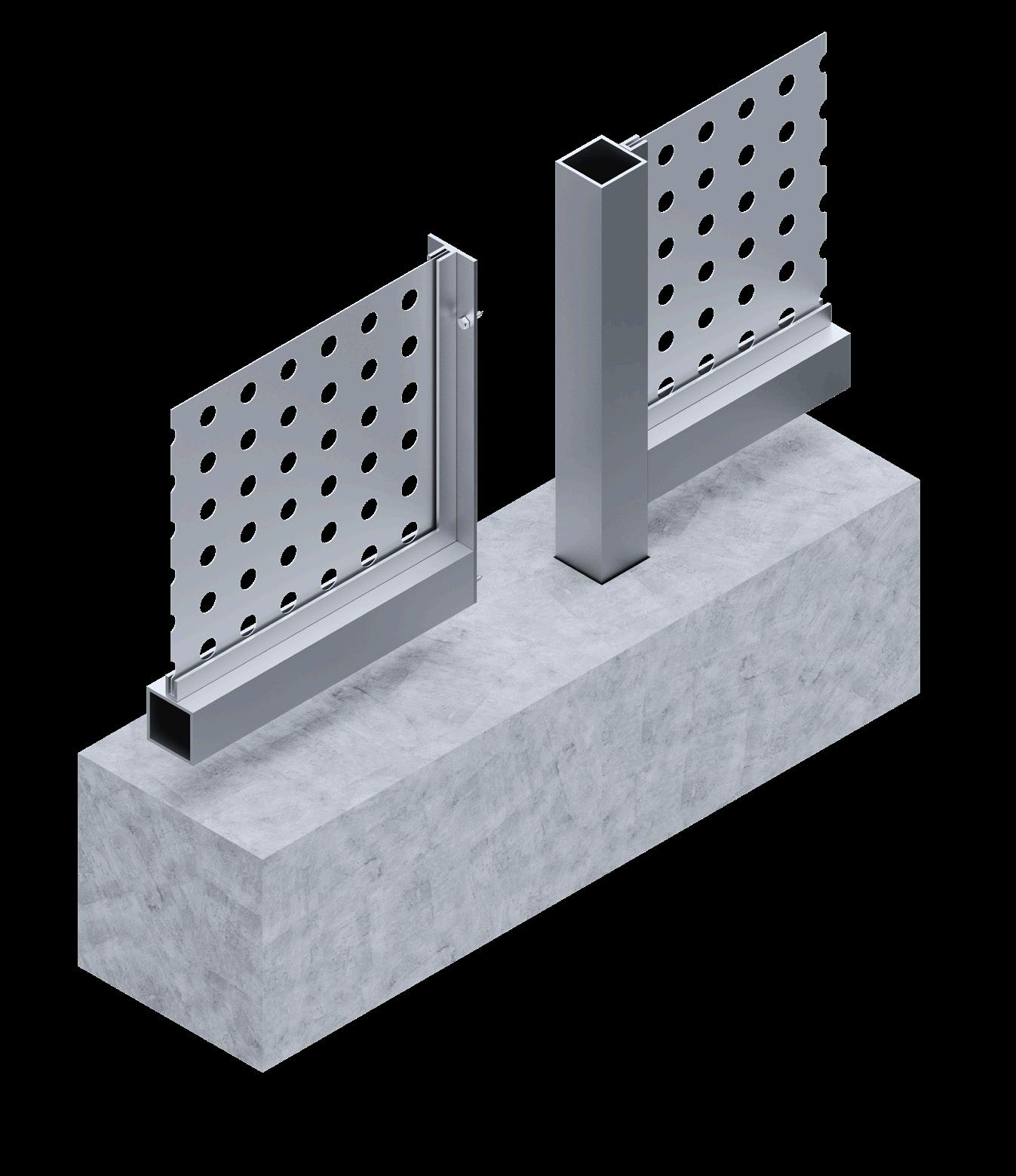 The following detail illustrates how the panels should be secured to the concrete curb. The pieces are shown separately so that when comparing them with a final render, the involved parts of the system are clear, thus minimizing any errors in their placement.