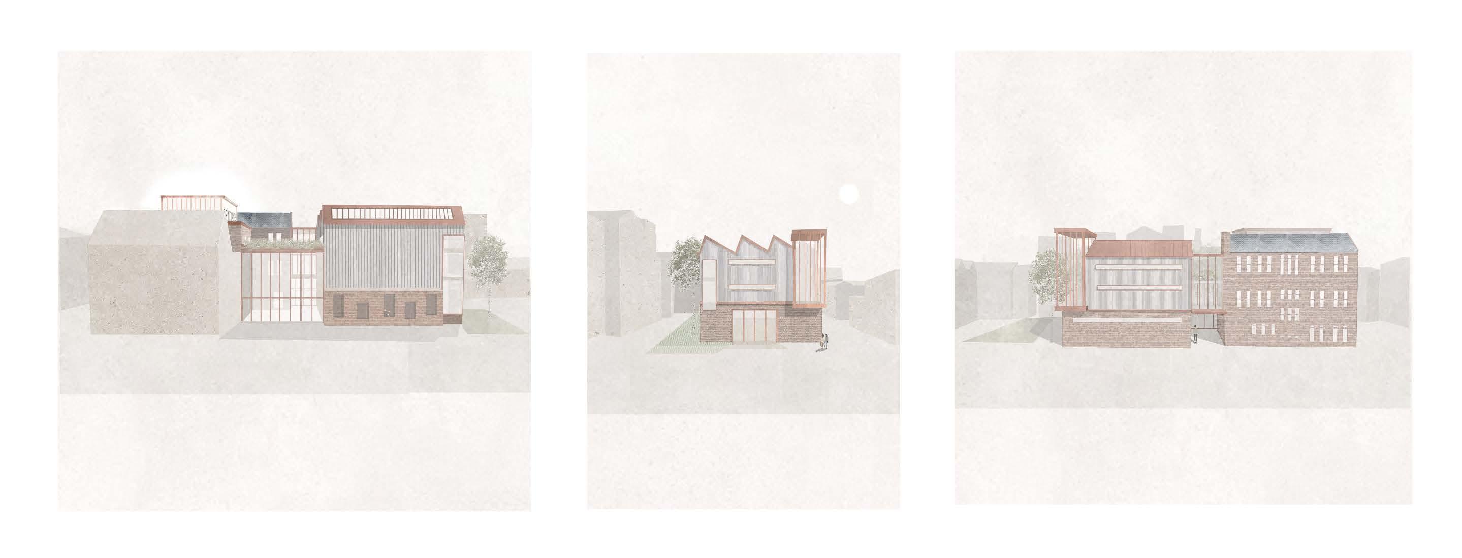 VISUALISATIONS OF THE APPROACH FROM THE PARK, THE CAFE BRIDGING THE OLD AND NEW BUILDS AND THE LANTERN EXTENSION AT NIGHT