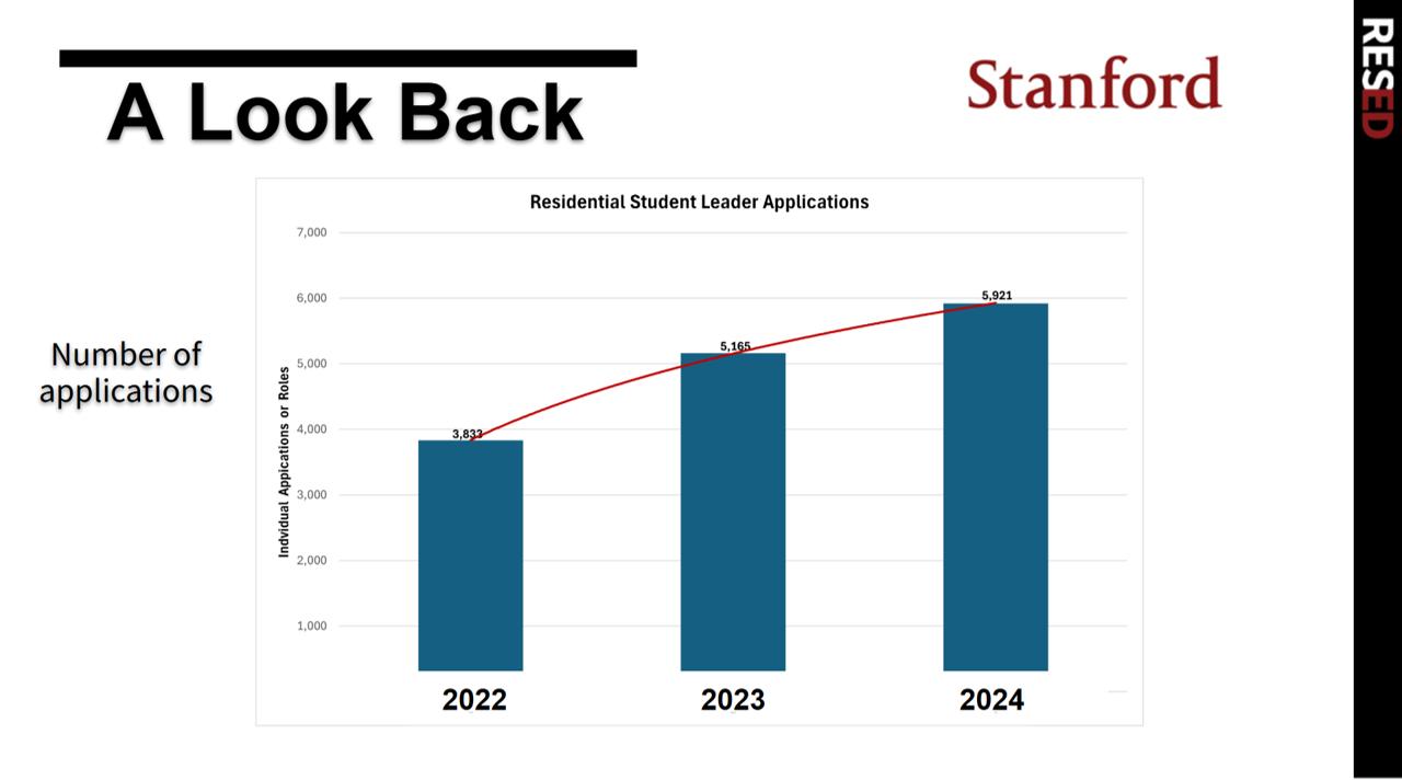 3-year graph trend (2022-2024) showing the number of residential student leader applications for resident assistant (RA) and Ethnic Theme Associate (ETA) positions post-COVID. Sophomores are no longer eligible to serve in the role. Individual students can submit up to 10 separate applications for 494 positions across 70 different undergraduate houses.