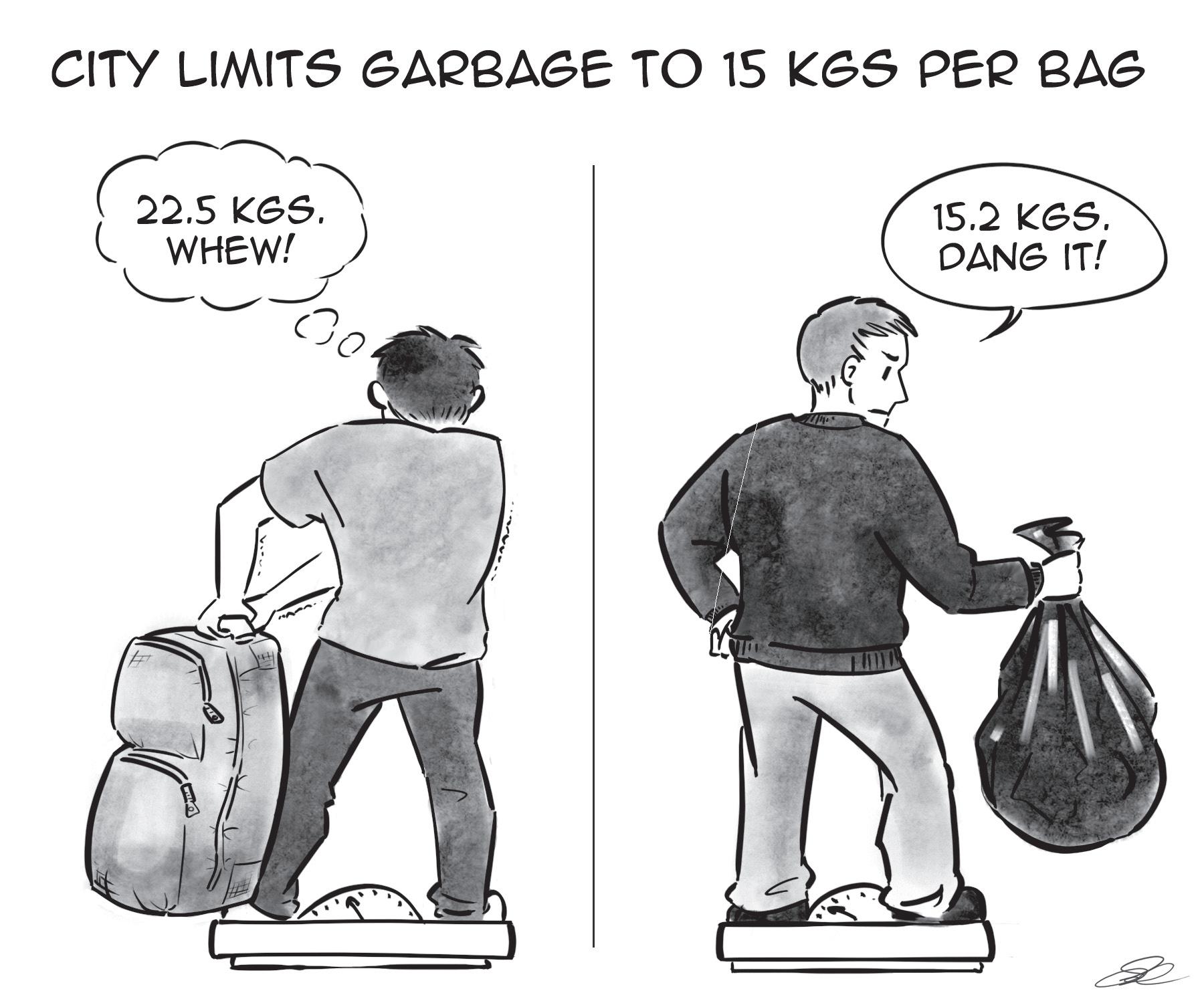 An “item” can include a garbage bag that weighs up to 15 kilograms; a garbage container with a capacity of 140 litres in which the resident can place several waste bags as long as the combined weight of the bags is not more than 15 kilograms per bin; and/or a furniture or bulky item that can’t be re-used or donated.