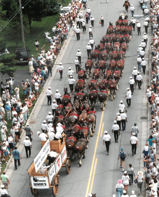 The famous 50-Horse Hitch was a year in the making. First dreamed up by Navan farmer Willard McWilliams to mark the 50th anniversary of the Navan Fair, the 50-Horse Hitch would require the cooperation of 18 Clydesdale owners and the cooperation of dozens more in the fabrication of five groups of reins, each stretching 180 feet long.