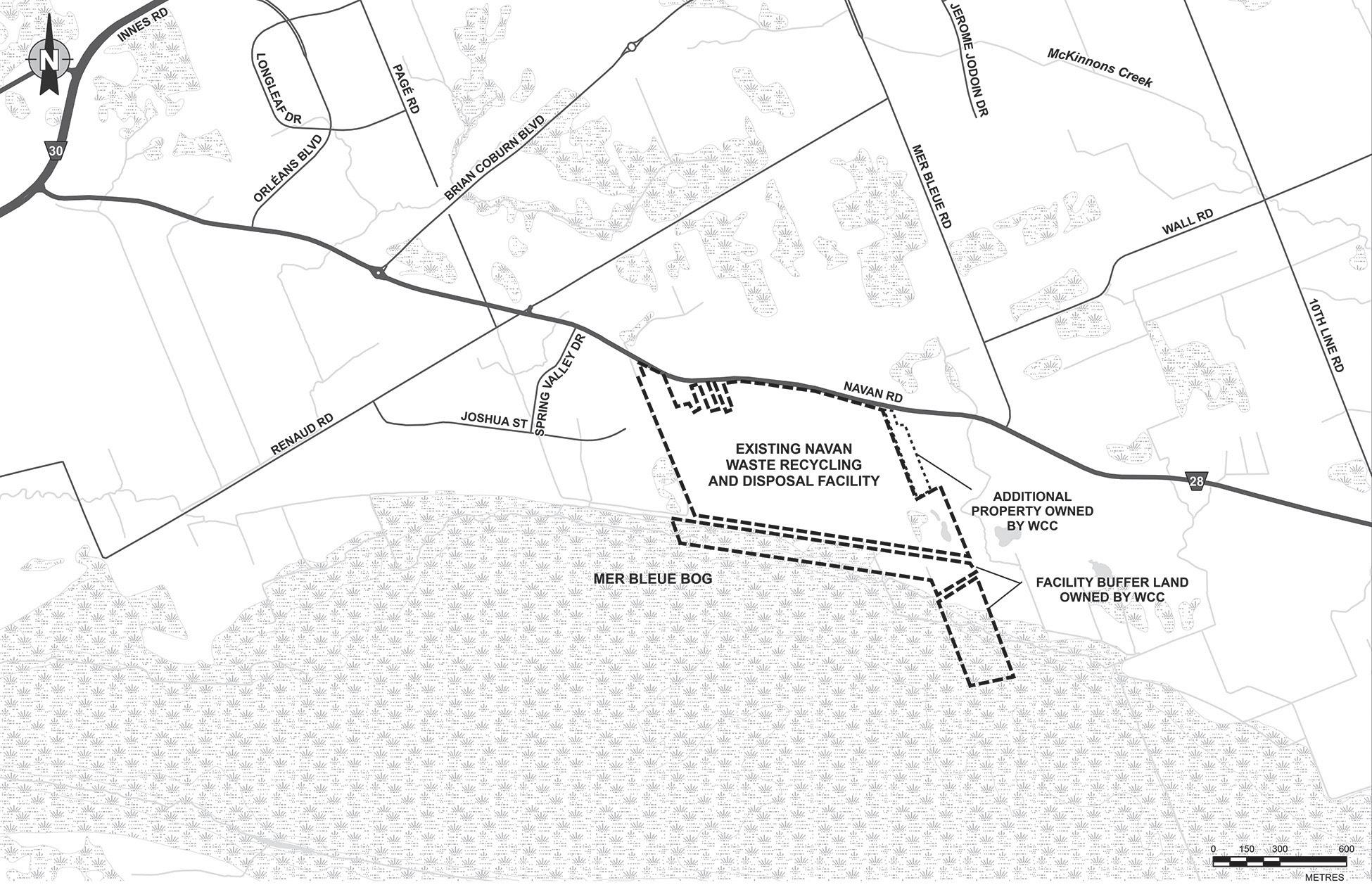 The Navan Facility provides a wide range of waste management services including processing materials for recycling, treating contaminated soils, hosting household hazardous waste day events, and the final disposal of solid non-hazardous municipal waste and asbestos waste, excluding putrescible waste. The Site is located in the eastern end of Ottawa at 3354 Navan Road, and most of the waste handled at the Site is generated within the City of Ottawa and neighbouring municipalities. The Site is a 92.85-hectare waste management facility that includes a 40-hectare landfill with an approved landfilling capacity of 7,600,00 cubic metres. The Site has been in operation since 1960 and was previously approved for an expansion under the Environmental Assessment Act in August 2007. In April 2009, WCC received Environmental Protection Act approval for the expansion of the Navan Facility. It is currently estimated that the Site could reach capacity in 2027.