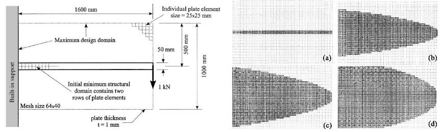 With the increasing influence of the ESO, many improved algorithms based on ESO have received a lot of attention. Because the initial ESO algorithm can only remove elements, but not add them, many researchers have begun to focus on how to simultaneously delete and add elements in an iterative process, and related studies have adopted similar logic to ESO through setting two parameters— Inclusion Ratio IR and Rejection Ratio RR—and respectively adjusting the ratio of each addition and deletion of elements.[11,12] However, the setting and adjustment of these two parameters have become key factors for the success of the algorithm development. Some studies have pointed out that this framework has a convergence problem; the ESO algorithm, and the 0/1 topology optimisation problem in its improved algorithm, also causes some defects in solution.[13-15] In view of the above problems, Xiaodong Huang and Mike Xie proposed a new Bi-directional Evolutionary Structural Optimization (BESO) method in 2007, and then carried out several update versions.[16-18] 3