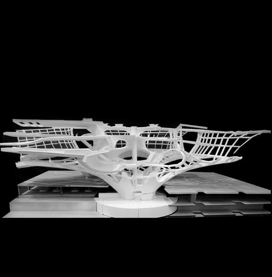 A view of the physical scale model of the terminal showing how the interweaving parts only share the circulation core with each other. Project credit: Tian Ouyang and Jasmine Gao.