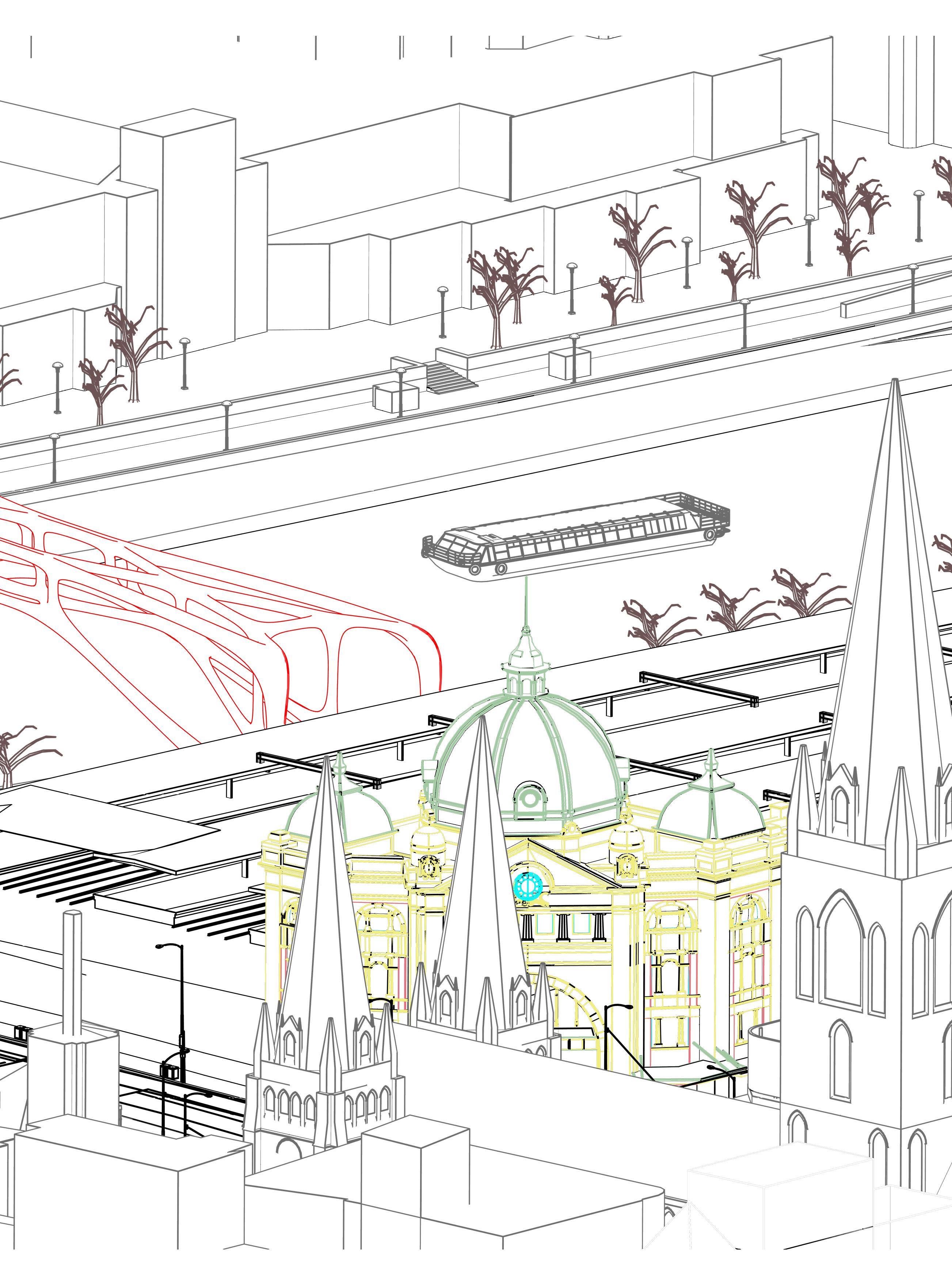 A sectional perspective of the terminal representing various modes of transportation and architectural space within the terminal. Project credit: Zehua Qi and Qi Liu.