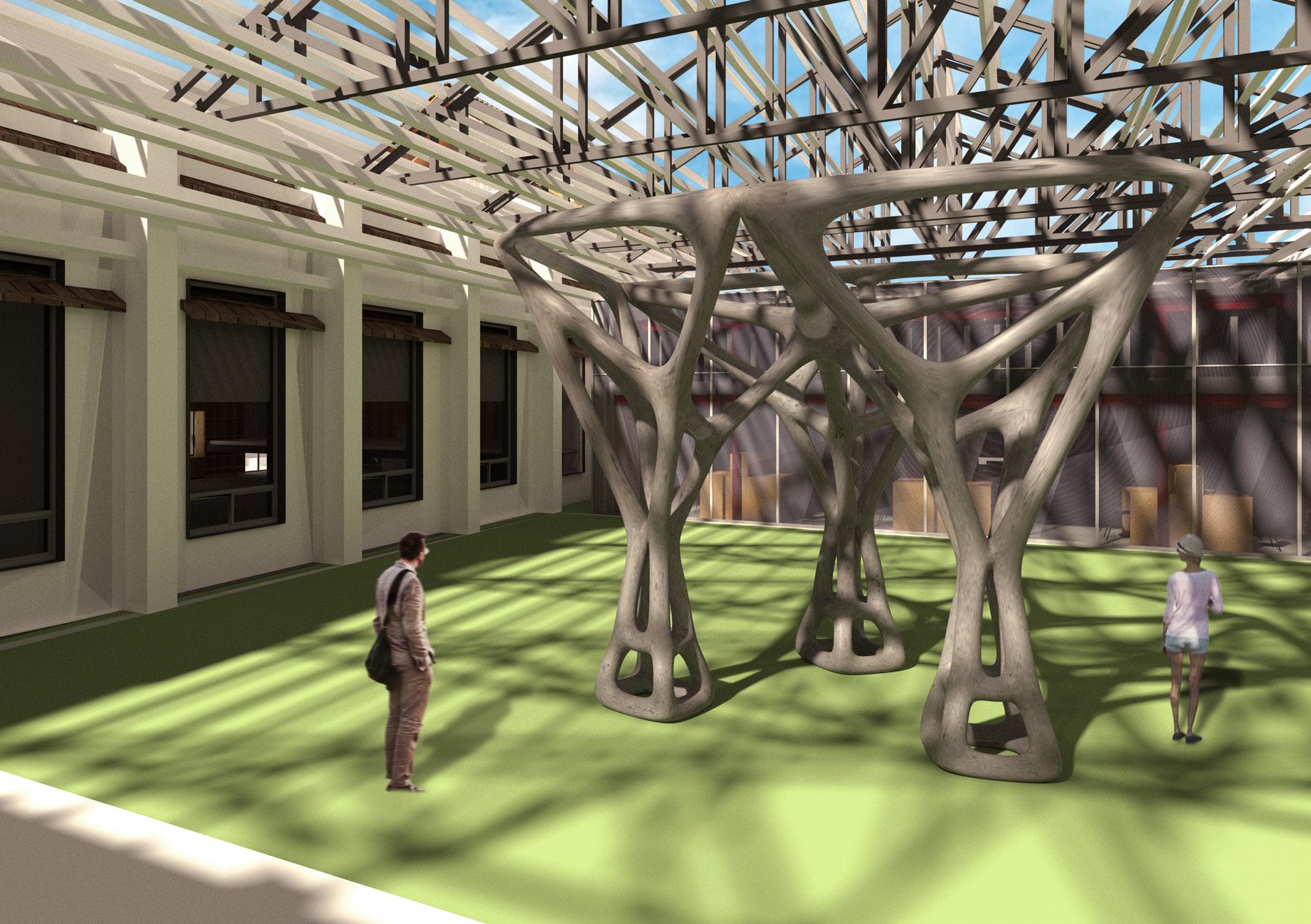 This studio explores the potential application of 3D robotic concrete printing as structural components through the intelligent computational design process in the field of architectural design. Advanced additive manufacturing technique, especially the large-scale concrete 3D printing technique, aims to change the construction industry. Nowadays, the significant scientific problem is how to achieve the printing process as a structural object.