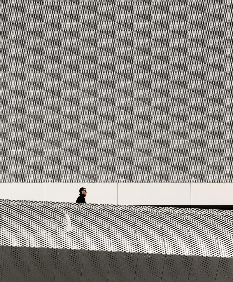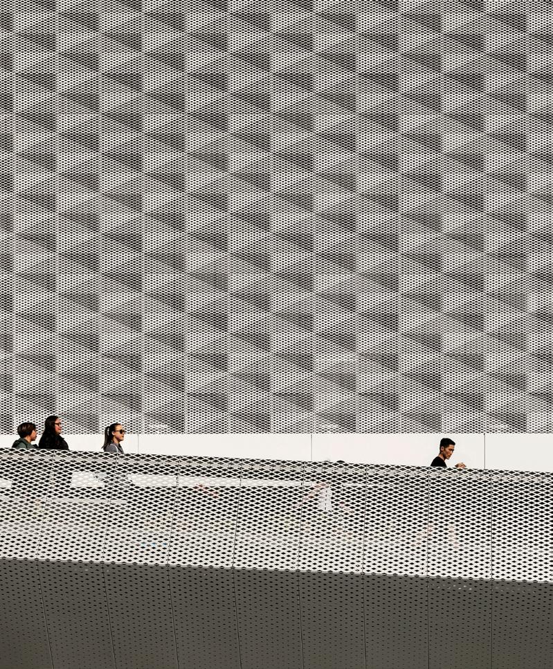 Cavagnero took special care to design laboratories—often grim and crowded with technical equipment along narrow aisles—to be open and luminous, flooded with natural light. No curtains are required to protect from the sun since Cavagnero took the roof to the edge of the building and folded it down the facades into a scrim of open metal latticework that allows views out while protecting the interior from the sun. He had adapted Le Corbusier’s concrete sunscreens into a lightweight metal equivalent that transforms with the sunlight—opaque and solid at times, shimmering at others.