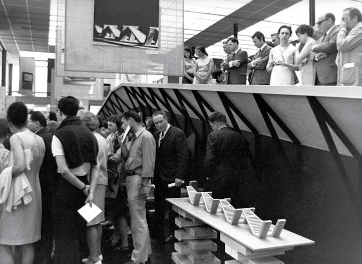 While the exhibition text mentions the oblique function just once, its principles dominated the show, the boldest evidence of which was the practicable itself. An accompanying promotional flyer for the exhibition was perforated and scored in such a way as to suggest that even a flat sheet of paper could be transformed into a miniature oblique structure. Referencing the installation at the end of his curatorial statement, Parent calls it une expérimentation implicite. 9 The phrase yields multiple, slightly different translations in English, with the word expérimentation variably referring to an experiment, experience, or experimentation. Similarly nuanced shifts in meaning are also present in the original French. Accordingly, the meaning shifts depending on one’s relationship to the practicable as an object. For the architect who created it, it can be seen as an experiment whose implicit aims have not yet been fully revealed, whereas for the users, it can be an experience whose occurrence is not entirely conscious, like a minor background event. The user’s experience, in this sense, is the architect’s experiment, a relationship that Parent further articulated in Vivre à l’oblique, published the following year. The dynamic of people engaging the ramp and the architect observing the interaction—while also placing movement on display as part of the exhibition—is one of several aspects of what throughout the later tour constituted participation and research;