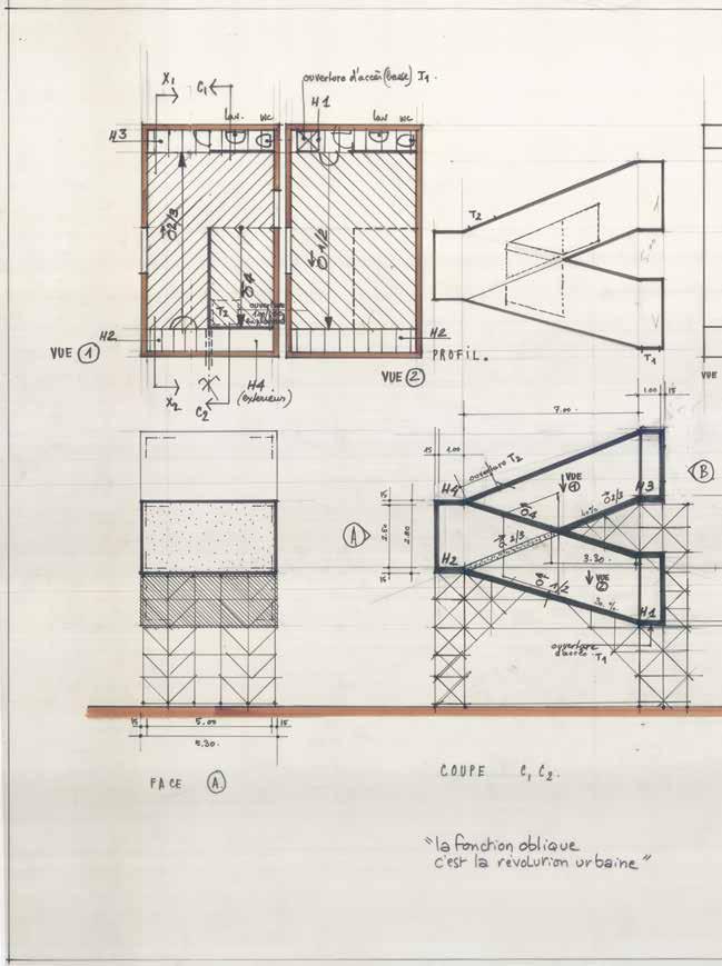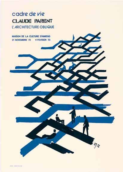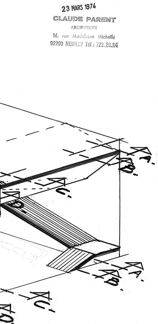 his explorations of inclined planes according to the theory of the oblique function. La fonction oblique, as it is referred to in its original French, was initially the result of Parent’s productive, albeit relatively brief, collaboration with Paul Virilio, with whom he cofounded the group Architecture Principe in the mid-1960s.5 Virilio, who later emerged as a leading theorist and philosopher, was a decade younger than Parent and, at that time, in an early stage of what turned out to be an auspicious career. The group— part intellectual think tank and part architecture office—advocated for the use of inclined planes in buildings instead of level floors, a radical proposition with an intended impact on all scales of human habitats, from individual bodies to entire cities. According to Parent and the group, sloped surfaces inspire people’s active engagement with the built environment, the anticipated bottom-up effect of which was to be architecture’s renewed social relevance.6 By provocatively proposing to place all of life’s activities on oblique substrates, they envisioned the future of architecture free of orthogonal form as well as of strict distinctions between program and circulation, that is, between predetermined uses of space and the necessary movement through it.7 Architecture Principe’s eponymous manifesto-magazine captured a desire to emancipate architecture and its inhabitants from the outdated orthodoxies of modernism, while also projecting an alarming sense of anxiety and doom about the status quo.8
