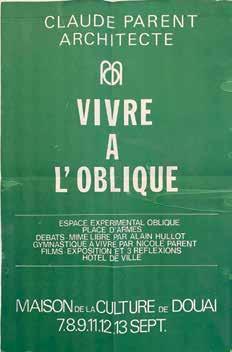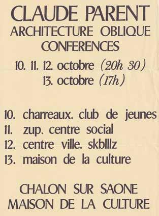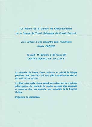 center, the Club de jeunes des Charreaux, on the western edge of the city— interrupted by a jazz rehearsal and rounds of foosball—while the following evening he appeared at a social club in the Prés-Saint-Jean district as part of an event organized by an urbanist working group.94 These appearances were orchestrated by the cultural center’s administration, with Parent feeling a sense of being “parachuted” into these locations under less than ideal circumstances, often having to quickly adapt to social situations as they emerged. On the third day of these roaming appearances, for instance, Parent was dispatched to the city center, where he was unexpectedly confronted by dozens of local shopkeepers more eager to share their grievances with the municipal administration than discussing the oblique function.95 His final public talk took place at the maison de la culture on a Saturday afternoon—unlike the other appearances throughout the week, this was a ticketed event with the admission price of five French francs, or about three euros in today’s currency. A local newspaper reported was an audience of some fifty people, including city officials.96 Parent recalled a patient mayor, engaged, supportive, and willing to sit through a three-hour architecture lecture.97 The sampling of different populations, neighborhoods, and organizations helped fulfill Parent’s aspirations to broaden his audience, and he described the total sum of such experiences as transformative. Reflecting on his encounters in Chalon, he writes: “Little by little, I got into the habit of better understanding, of more quickly defining what people came to ask me, what was important to them.”98 Likewise, he noted that his presence was equally critical to city officials—particularly the maison de la culture leadership—who were seeking new ways to engage people that such institutions otherwise failed to attract; he saw himself in the role of a catalyst, “a powerfully ionized intermediary.”99