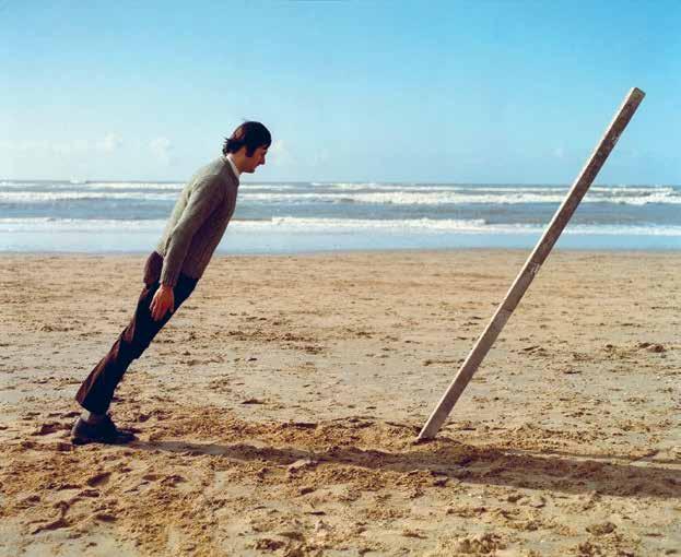 juxtaposed against the flatness of the sea level in the background. Rather than standing upright his body slants forward, astonishingly parallel to the oblique angle of a wood post in front of him. A single line of text below the picture, “Study for horizon,” turned out to be its title, a self-portrait by the Icelandic artist Sigurður Guðmundsson from 1975.1