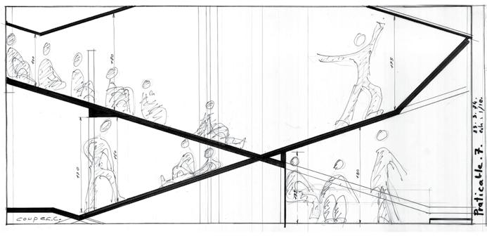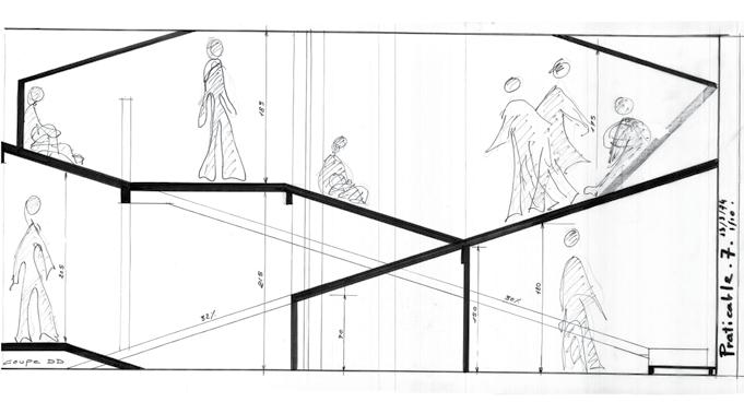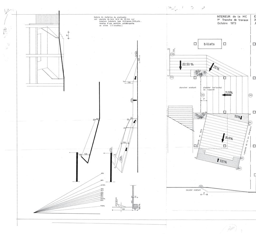 A set of architectural drawings from Parent’s office, dated March 23, 1974, describe the design of a room-sized installation consisting of a series of interconnected ramps and titled Praticable no. 7. It is the sole scheme among the archived practicables not explicitly identified according to a specific city or venue, nor does it appear to be an alternate version of any of the other site-specific designs.