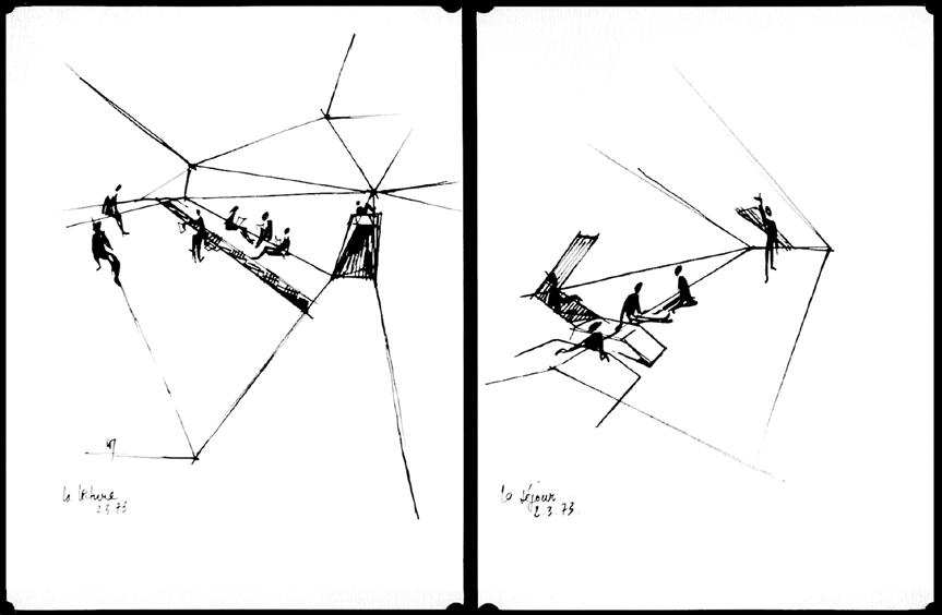 Sketches from the CPA 473 folder Dessins utopiques de Claude Parent (1966–1982), Fonction oblique: Vivre à l’oblique (1973–1975 ), part of the Claude Parent Archives housed by the Kandinsky Library at the Centre Pompidou in Paris.