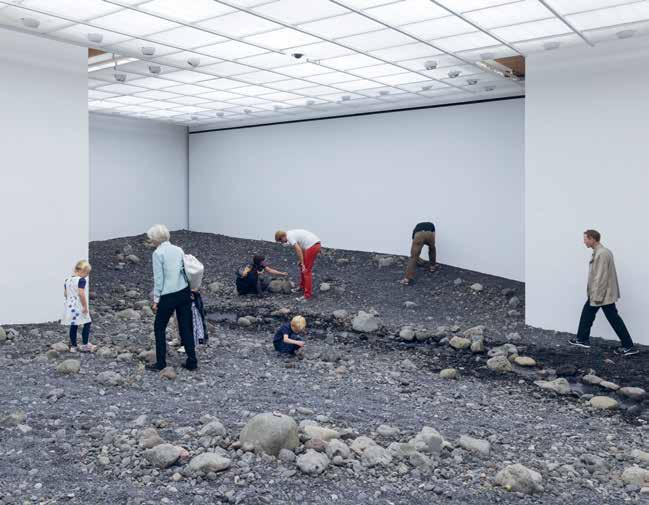 There is no shortage of sloped floors in contemporary architecture. But what would be our time’s equivalent of a practicable—a temporary installation framed by existing architecture that questions the nature of the ground we inhabit? Despite the perennial proliferations of installations by architects, some of the most provocative encounters with the ground have over the last decades been produced by artists working across other fields. As a fraction of the most compelling examples, this includes widely known artworks such as Olafur Eliasson’s Riverbed installed at the Louisiana Museum of Modern Art in Denmark in 2014; the artist Pierre Huyghe’s site-specific intervention After ALife Ahead produced for the 2017 Skulptur Projekte exhibition in Münster, Germany; as well as the scenery for the opera Sun & Sea (Marina) by Rugilė Barzdžiukaitė, Vaiva Grainytė, and Lina Lapelytė, produced for the Venice Biennale in 2019 and on a world tour ever since. Each of these works uses the floor as an element that introduces a radical shift to an interior space, while also— not unlike the practicables—expressing distinct attitudes about human experience. Like the oblique installations, they serve as devices for speculating about the future of the living environment, while departing from Parent’s anthropocentric perspective by explicitly prioritizing, for instance, questions related to ecology, climate change, and the agency of nonhuman species.9 The floor in both Riverbed and After ALife Ahead is sloped, yet more significant than the particular geometry of each construction is its materiality. Along with Sun & Sea (Marina), these installations bring to life Parent’s notion of “the culture of tactility,” or the use of different materials on the floor as a way of eliciting various reactions from people, an idea that remained largely unrealized in his own work given that, as he admitted with some disappointment, “nobody was ever
